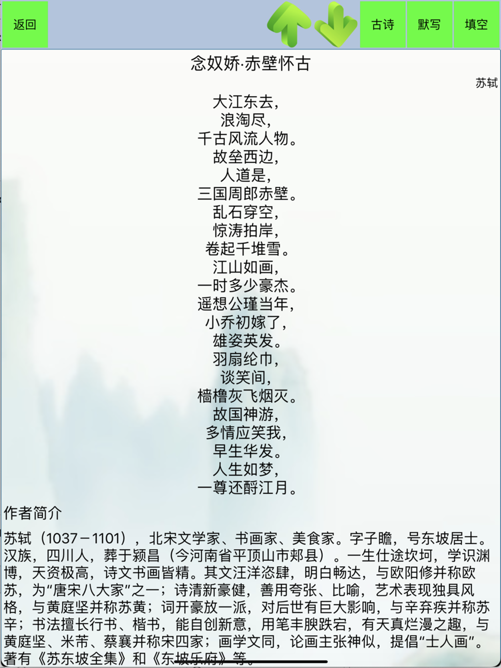 1.每首古诗词提供三种学习方法: 古诗文,测验和填空模式