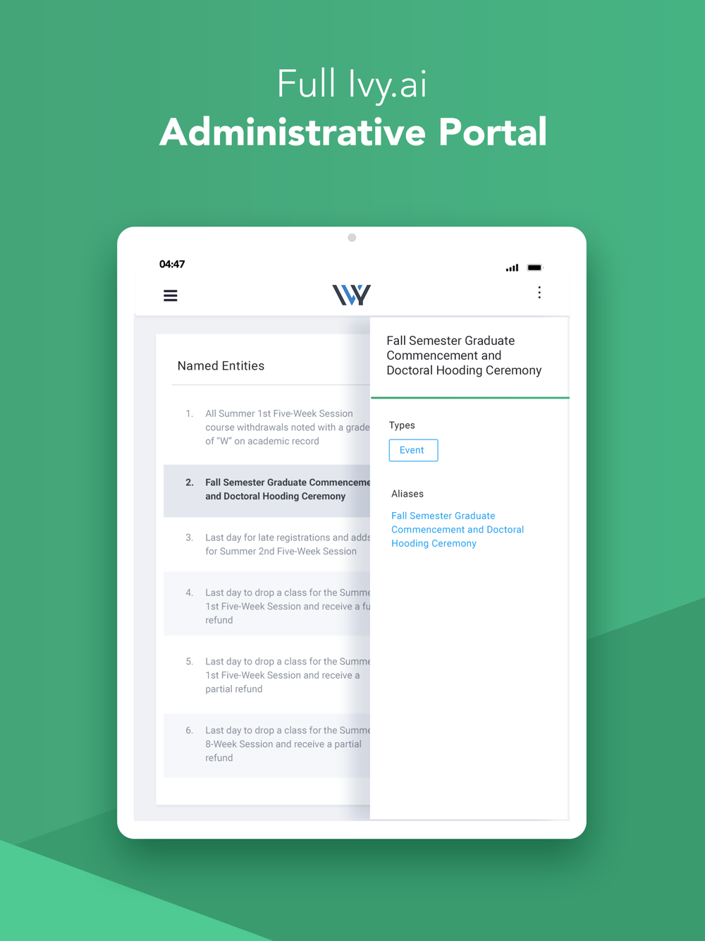 Ivy is an artificially intelligent self-service chatbot for colleges and universities. It's no secret that your users ask the same types of questions over and over. Your Ivy chatbot is designed to handle all your tier 1 support, allowing you to focus on the more consultative issues. Your users will get help immediately, on demand. Your customer service reps will be deployed more effectively and your bottom line will thank you.