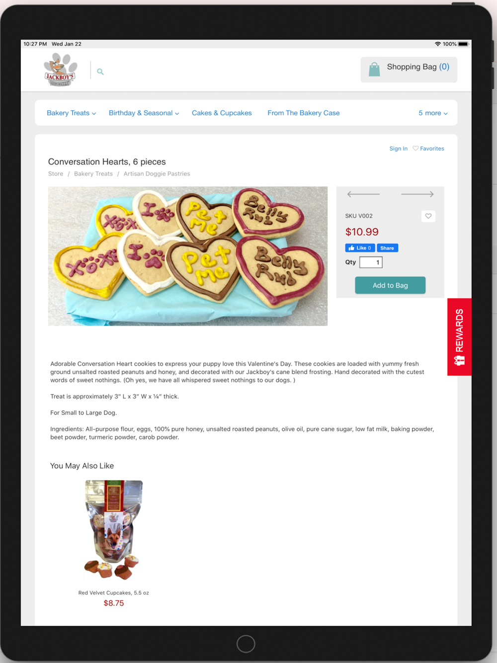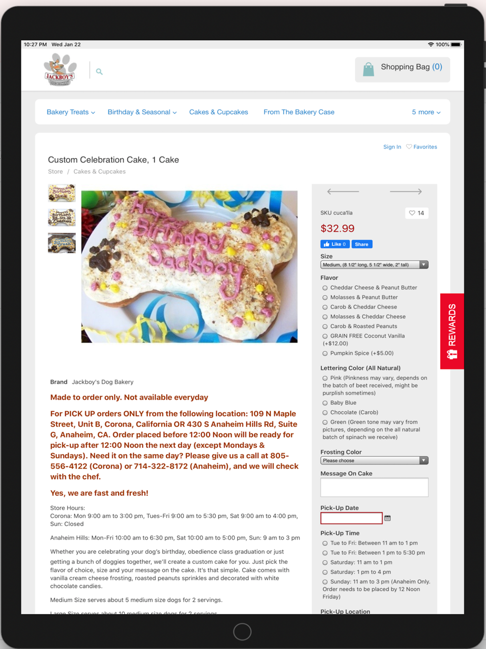 With 24/7 access to our extensive selection of dog cakes, treats and other pet supplies, the Jackboy's Dog Bakery app makes it easy to plan your dog's celebration or stock up on the go. Find your dog's favorite fresh baked treats and other pet supplies. Order dog cakes, cupcakes, treats, toys and more right on your phone and pick them up at your convenience at the Jackboy's Dog Bakery store of your choice, or have them ship to you (cakes and selected items pick up only).