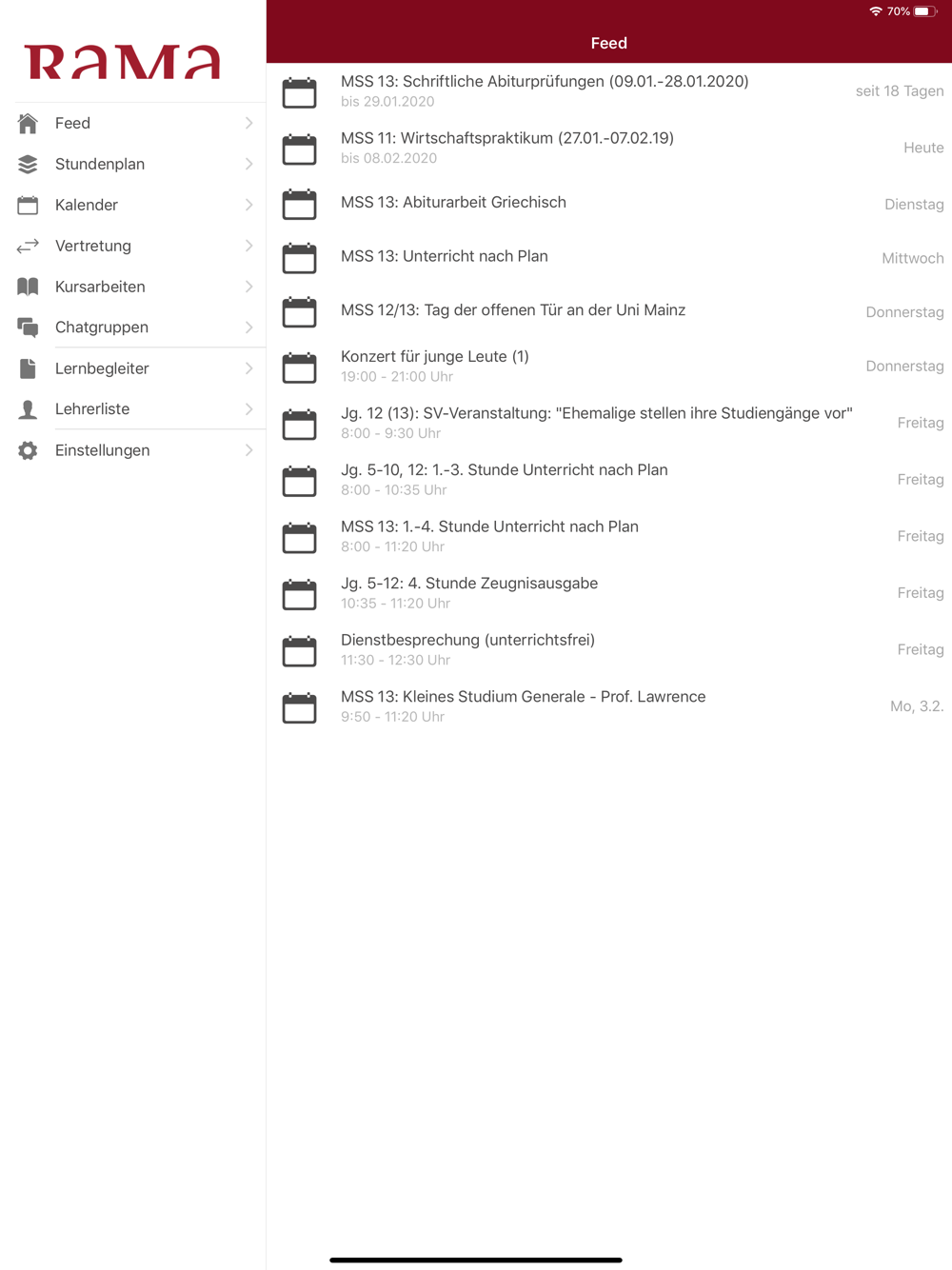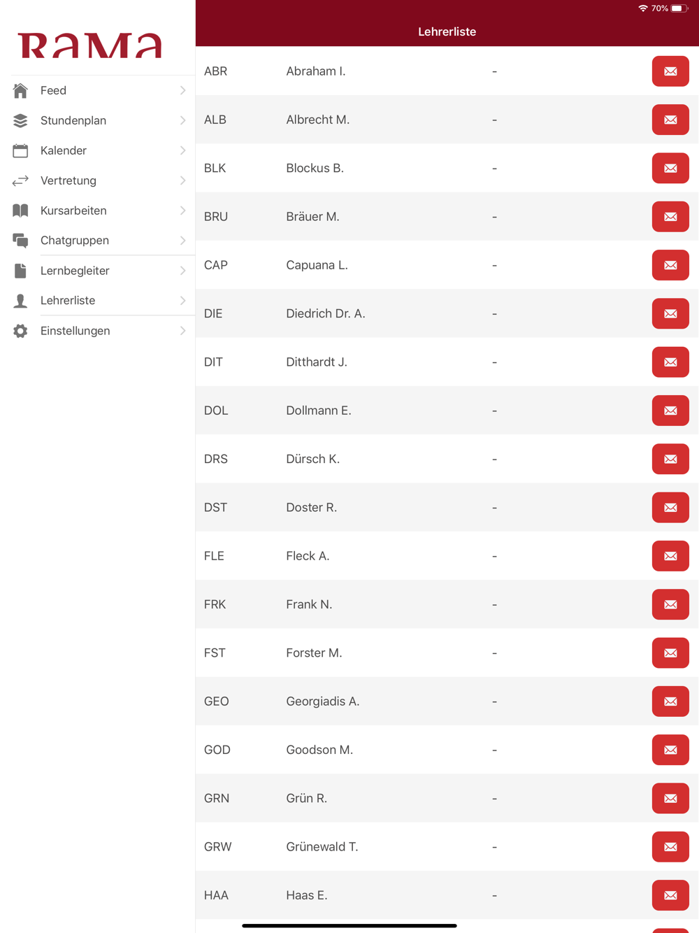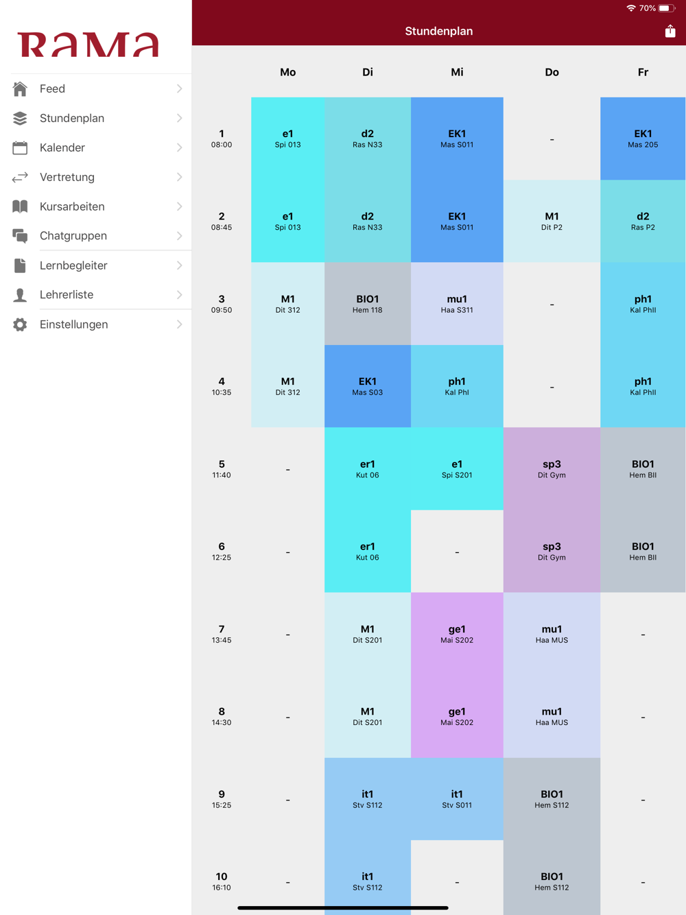 Die Rama App ermöglicht eine schnelle Anbindung an das Portal des Rabanus Maurus Gymnasium Mainz. Stunden- und Vertretungspläne sind schnell und individualisiert verfügbar. Für Chatnachrichten, Vertretungsplan-, Stundenplanänderungen und Elternbriefe werden Push Nachrichten verschickt.