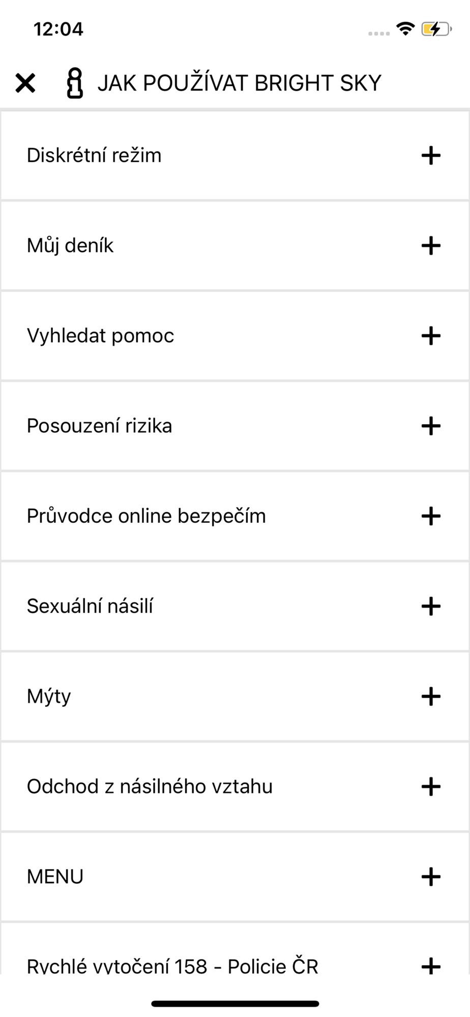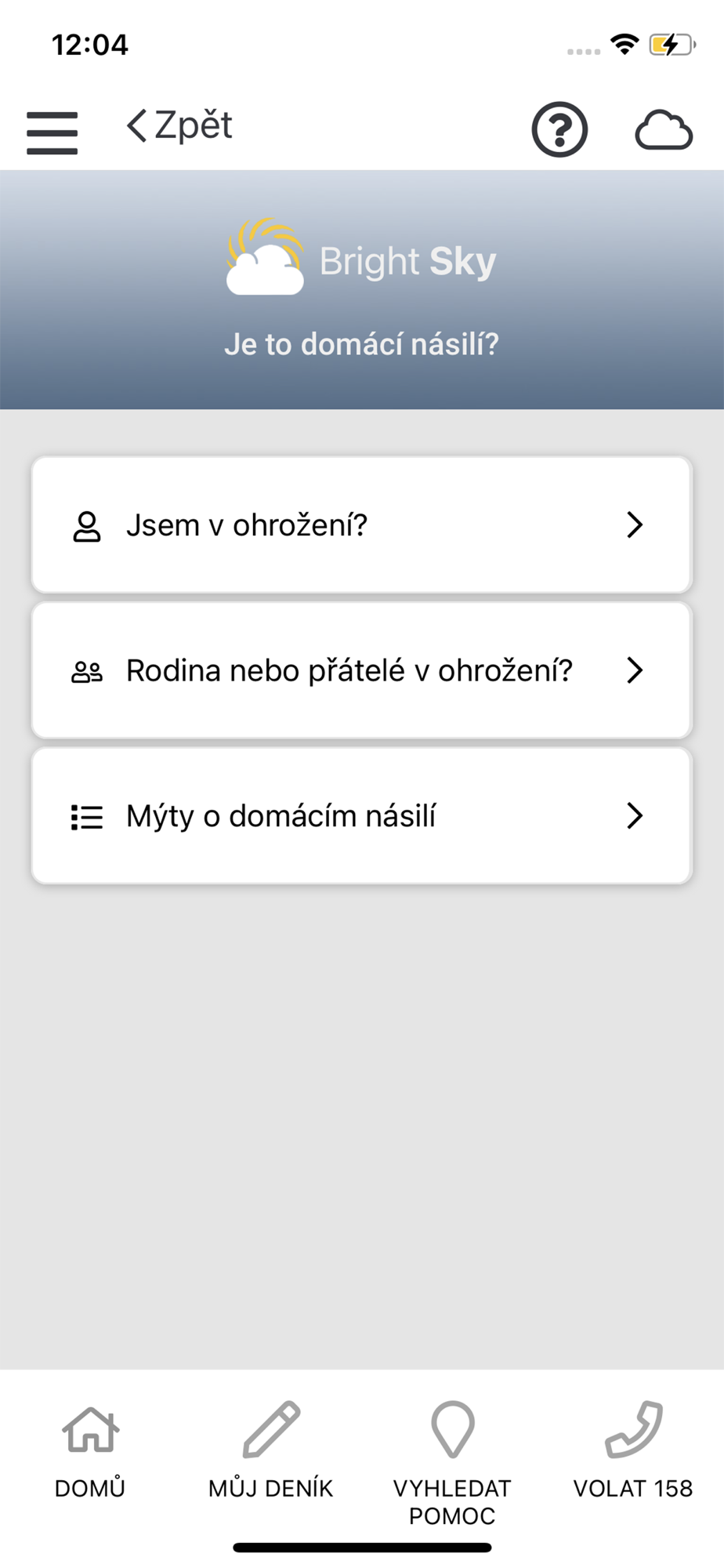* Dotazník „Jsem v ohrožení?“ je navržen tak, aby uživatelům poskytl informace o tom, zda se v jejich vztahu vyskytují prvky násilného jednání, případně mohou v části „Rodina nebo přátelé v ohrožení?“ vyhodnotit přítomnost rizikových faktorů ve vztahu někoho blízkého. Výsledky těchto dotazníků by však neměly být brány jako jediný ukazatel toho, zda se jedná o zdravý či násilný vztah. Pokud si nejste jisti, doporučujeme vám obrátit se na nejbližší specializovanou poradnu nebo v rámci aplikace Bright Sky vyhledat další informace.