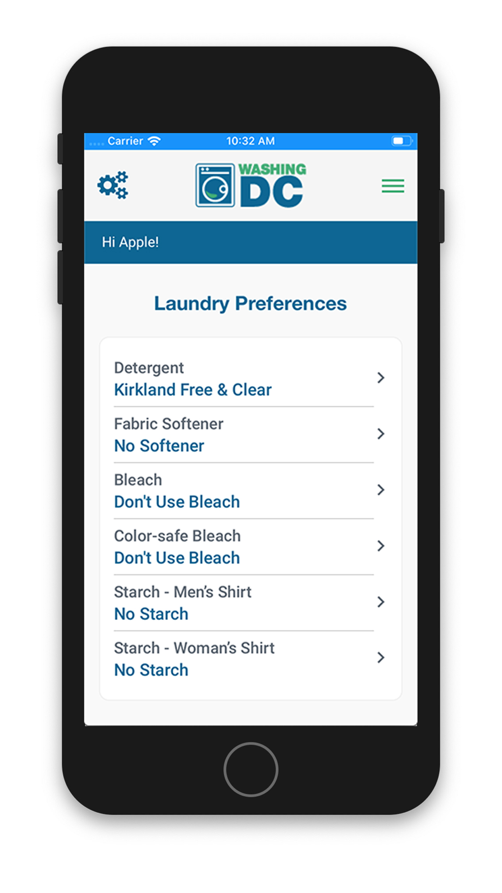 Choose your plan type – weekly or “by request,” detergents (familiar brands including eco-friendly, hypoallergenic and fragrance free), fabric softeners, wash temperatures, dryer preferences, dryer temperatures, folding preferences, and notifications types and frequency.