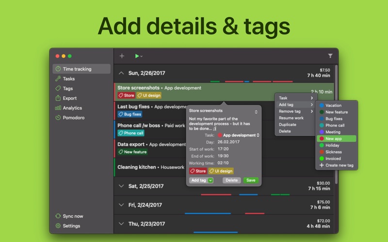• Start/pause/stop your working time without opening the app - via notification, Dock Menu or Menu Bar