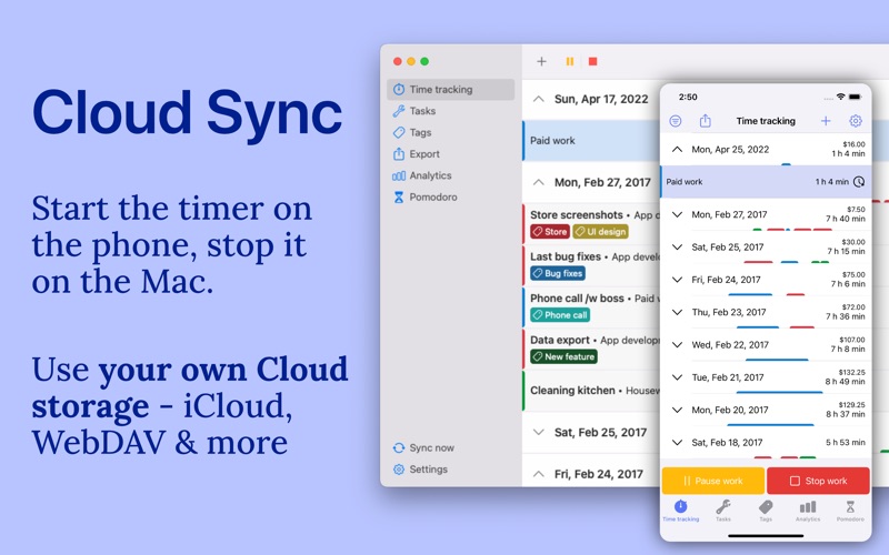 • Cross-platform time tracker app, works for all your devices (iOS app available!) incl. Cloud sync