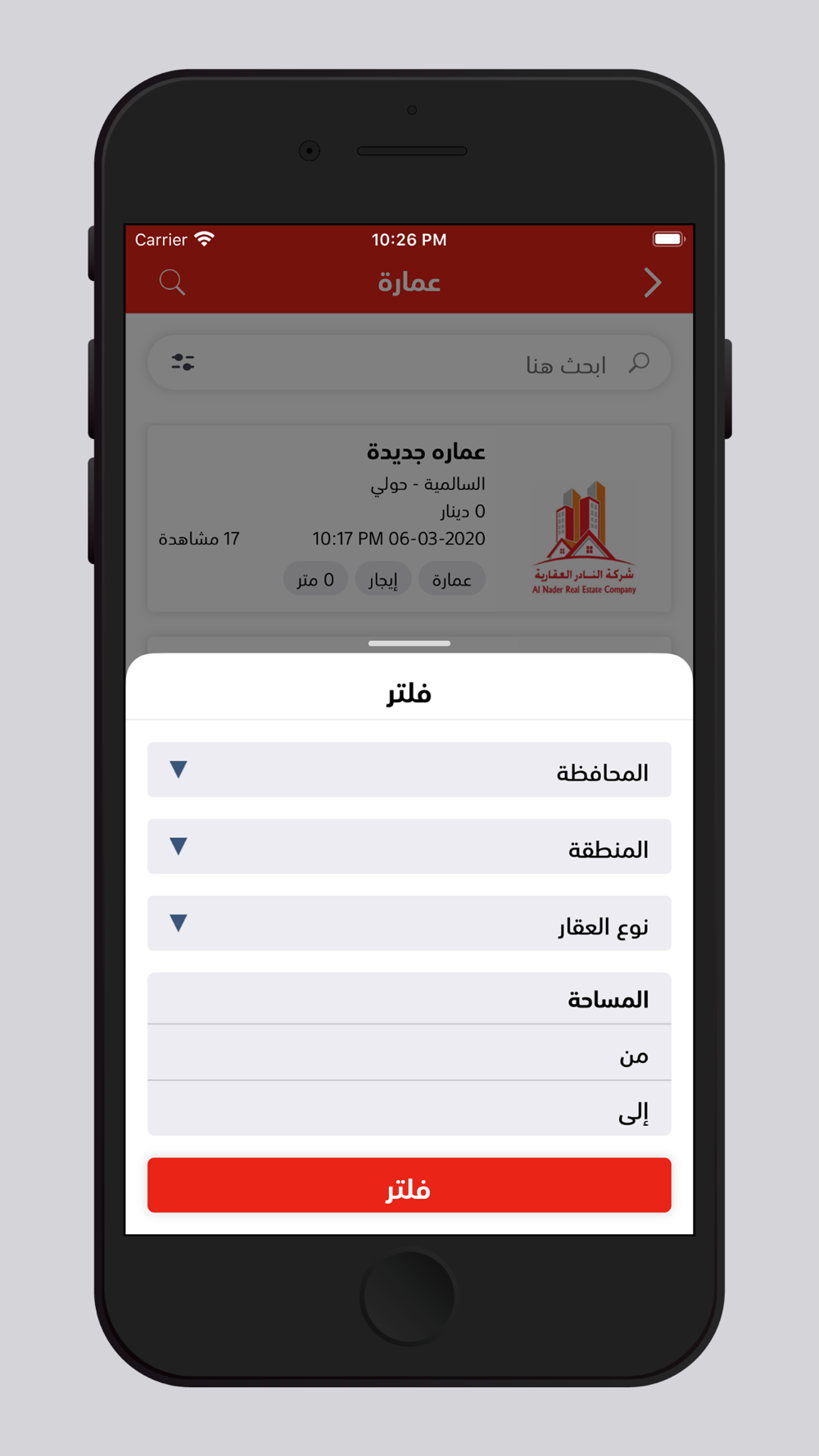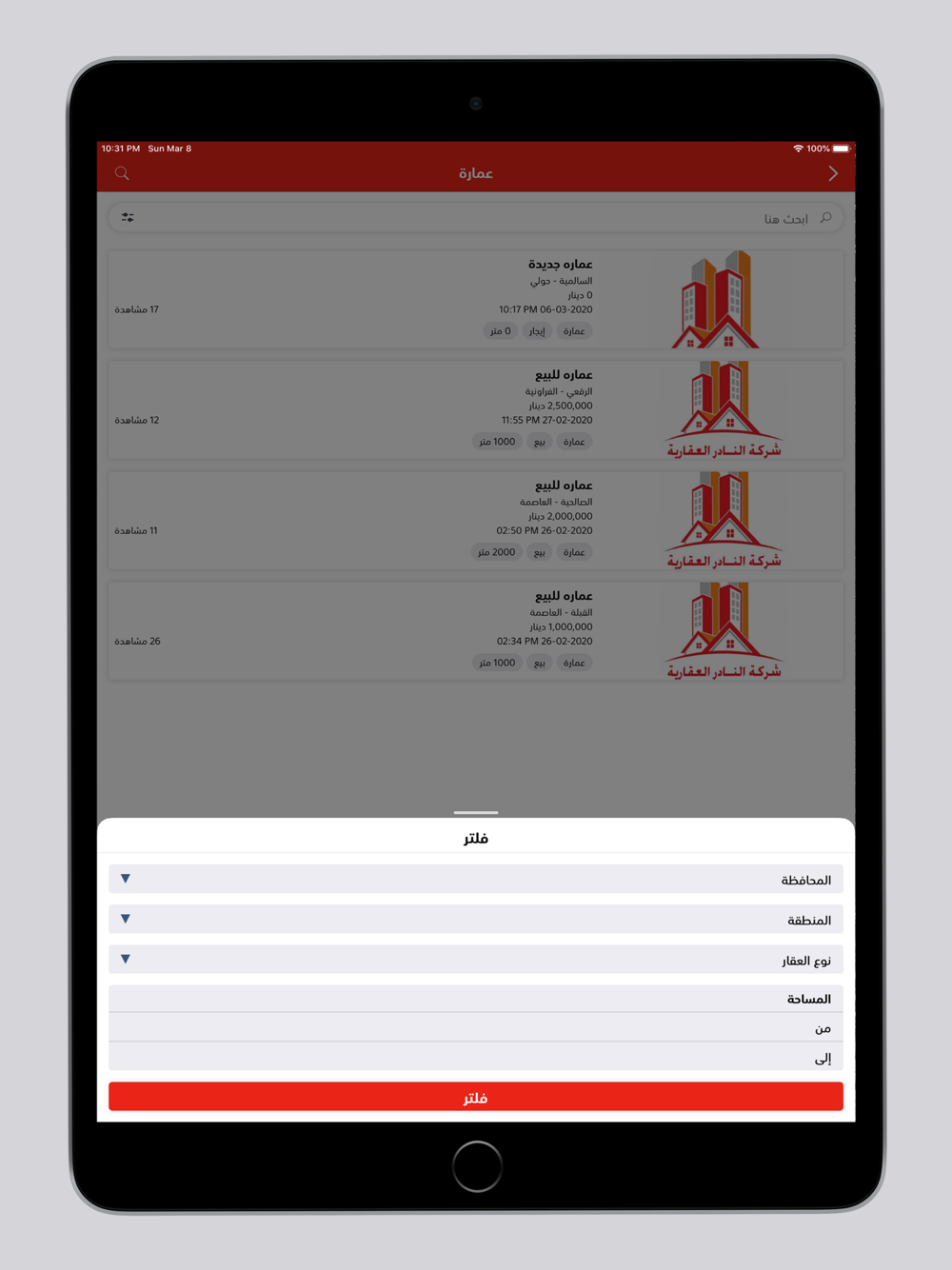 بواجهة مطوره وسهله ومريح للاستخدام لعرض عقاراتك سواء للبيع او لشراء او للايجار او مطلوب او للبدل وسهولة تنزيل اعلانك واضافة الصور في التطبيق مجانا وسهل الاستخدام ويوفر عليك البحث عن اي عقار موجود داخل الكويت او اي دولة اخرى والتواصل مع صاحب العقار بالاتصال مباشرة