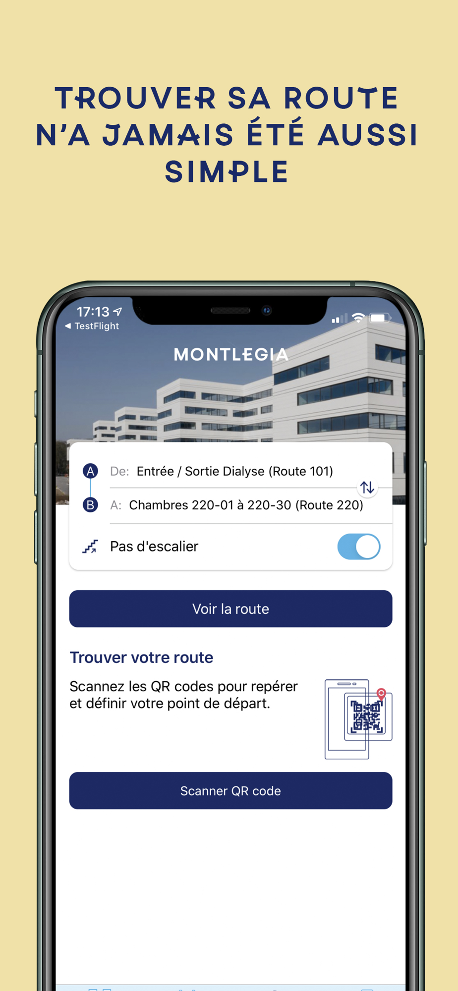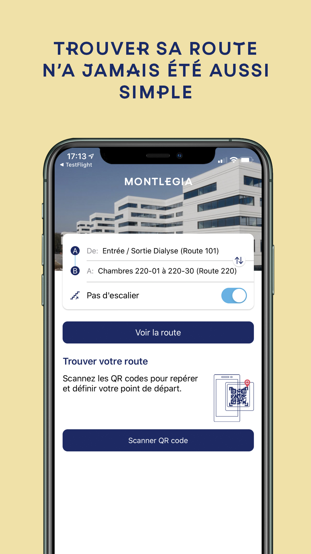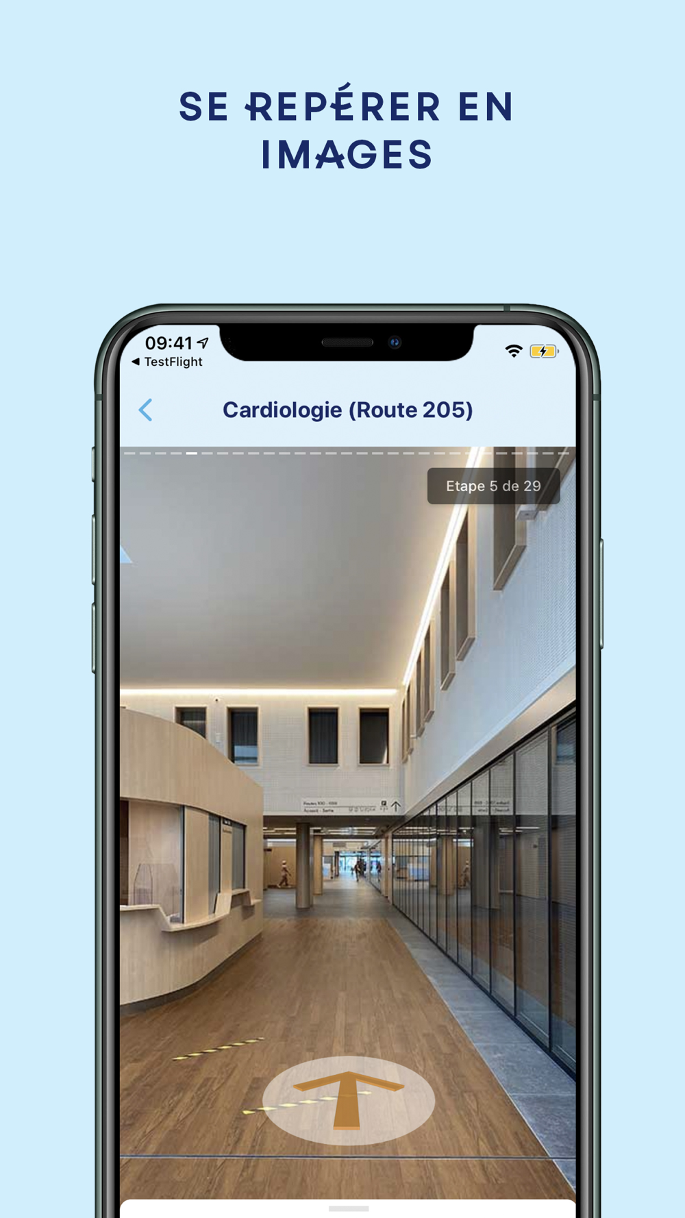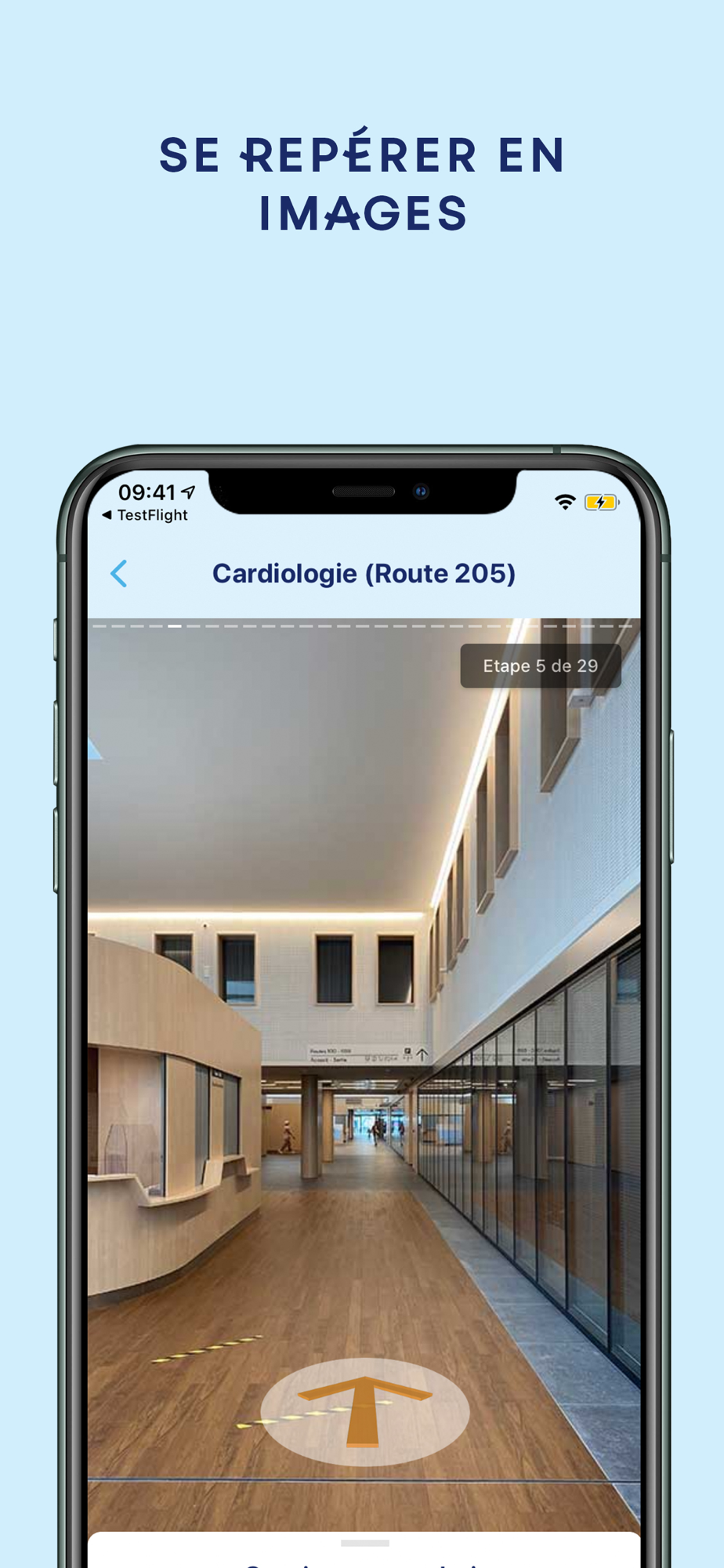 - Trouvez votre position exacte dans l’hôpital : possibilité de scanner un QR code pour déterminer votre localisation et vous aider à trouver votre route