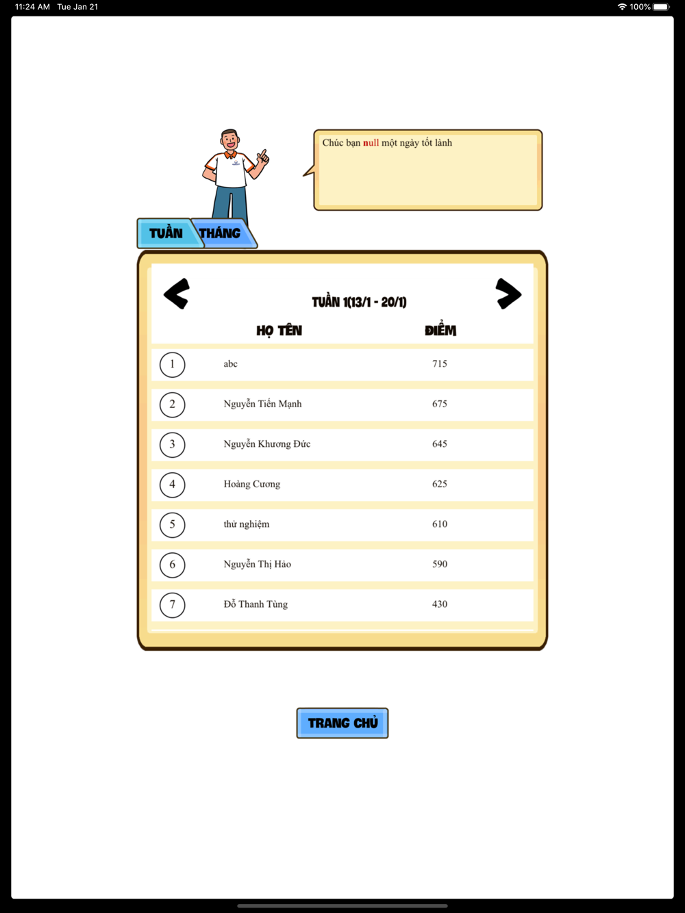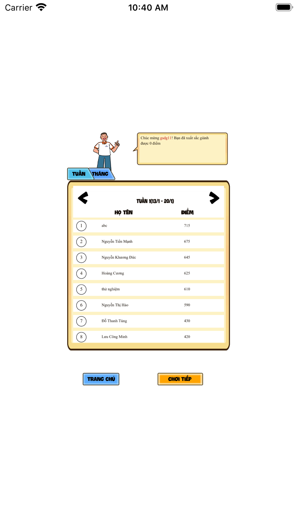 - Nhanh tay dành được số điểm cao nhất trước khi hết giờ. Số điểm bạn ghi được sẽ được tích lũy theo Tuần/Tháng. 03 người chơi có điểm số cao nhất sẽ được trao quà, điểm càng cao, quà càng giá trị.