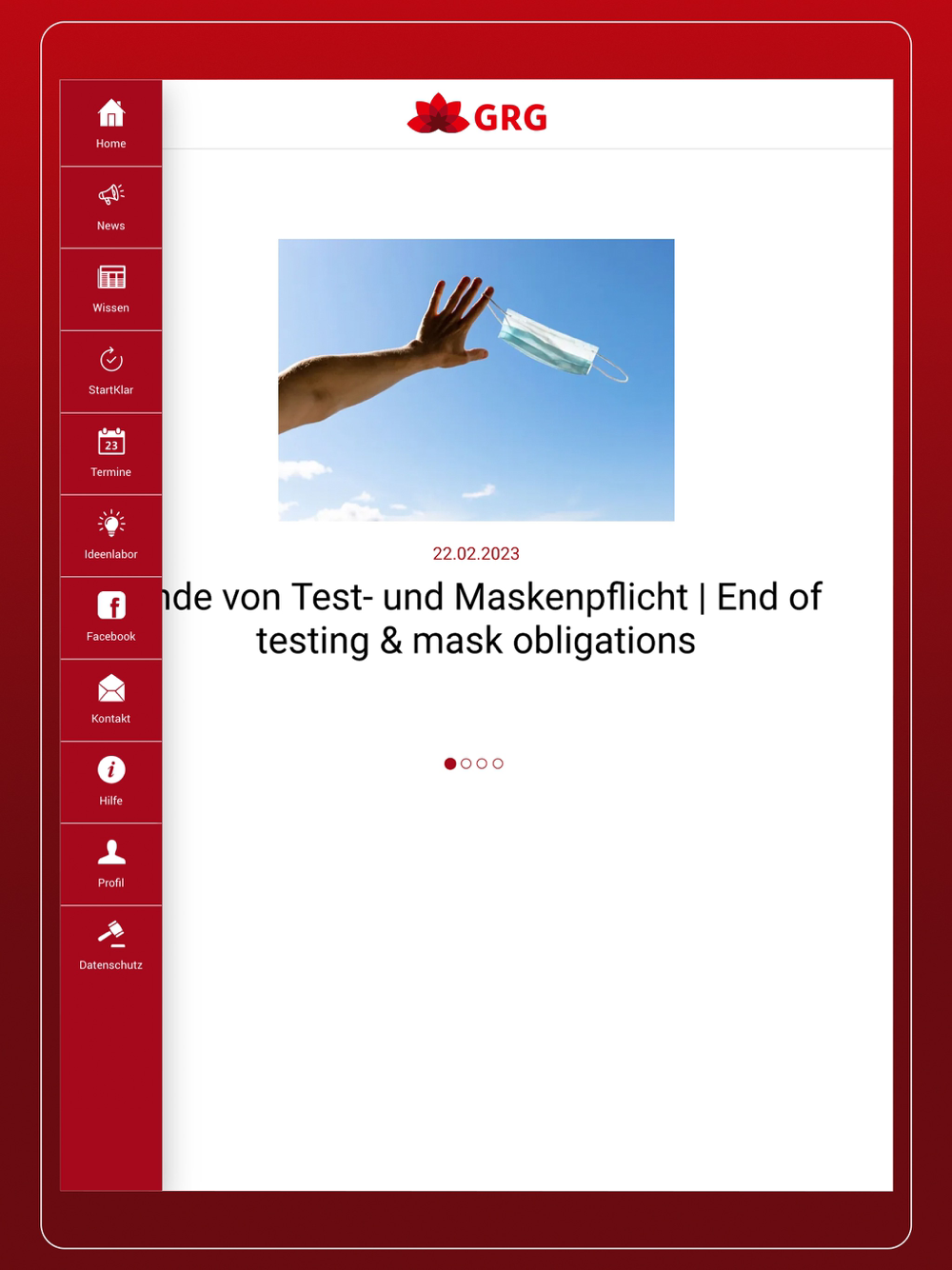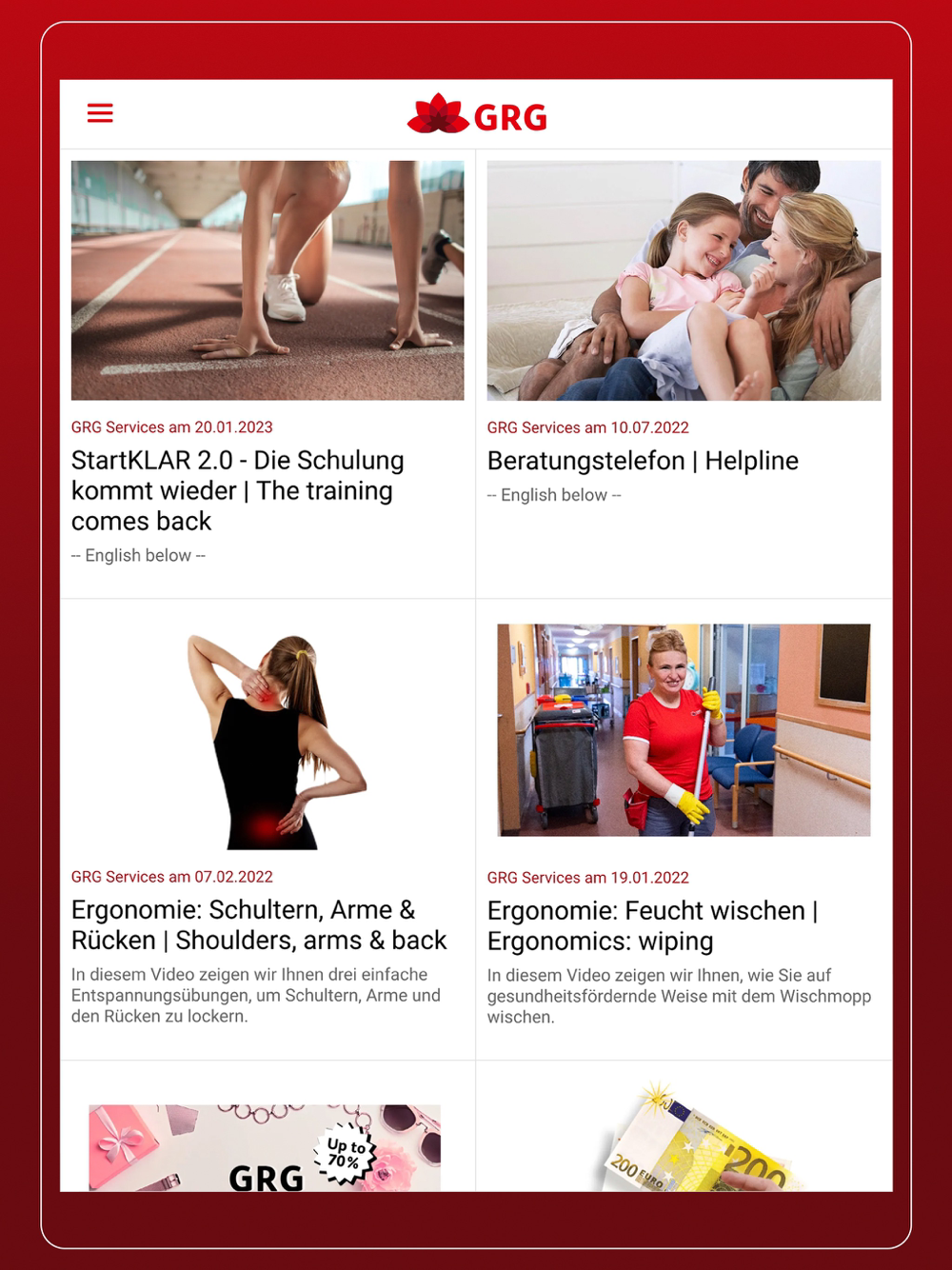 Die GRG App bündelt alle wichtigen Informationen an einem Ort: News zum Unternehmen, Entwicklungen der Branche und Wissen rund um das Gebäudereinigungshandwerk.