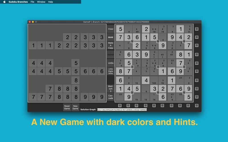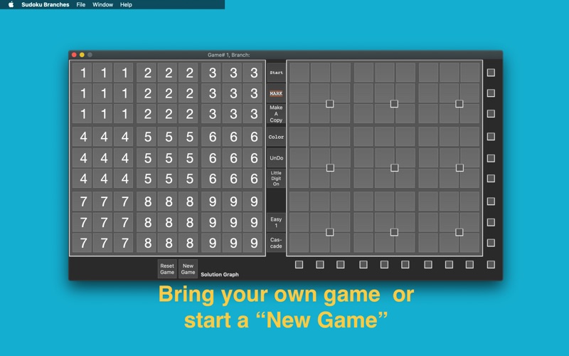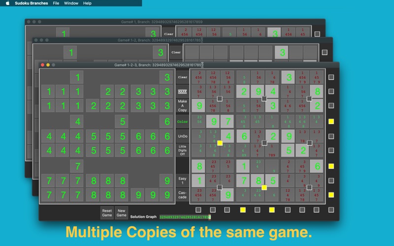 Bring your own puzzle or create a "New Game" from 5 ranges of difficulty. Solve the puzzle by selecting the next digit and clicking on the space to place it. When there is a choice of two or more digits in a space go ahead and "Make A Copy." Then play each choice in each copied game and continue to solve until you finish the puzzle or find an unsolvable game as shown by the red color dots. A completed game will have all green color dots.