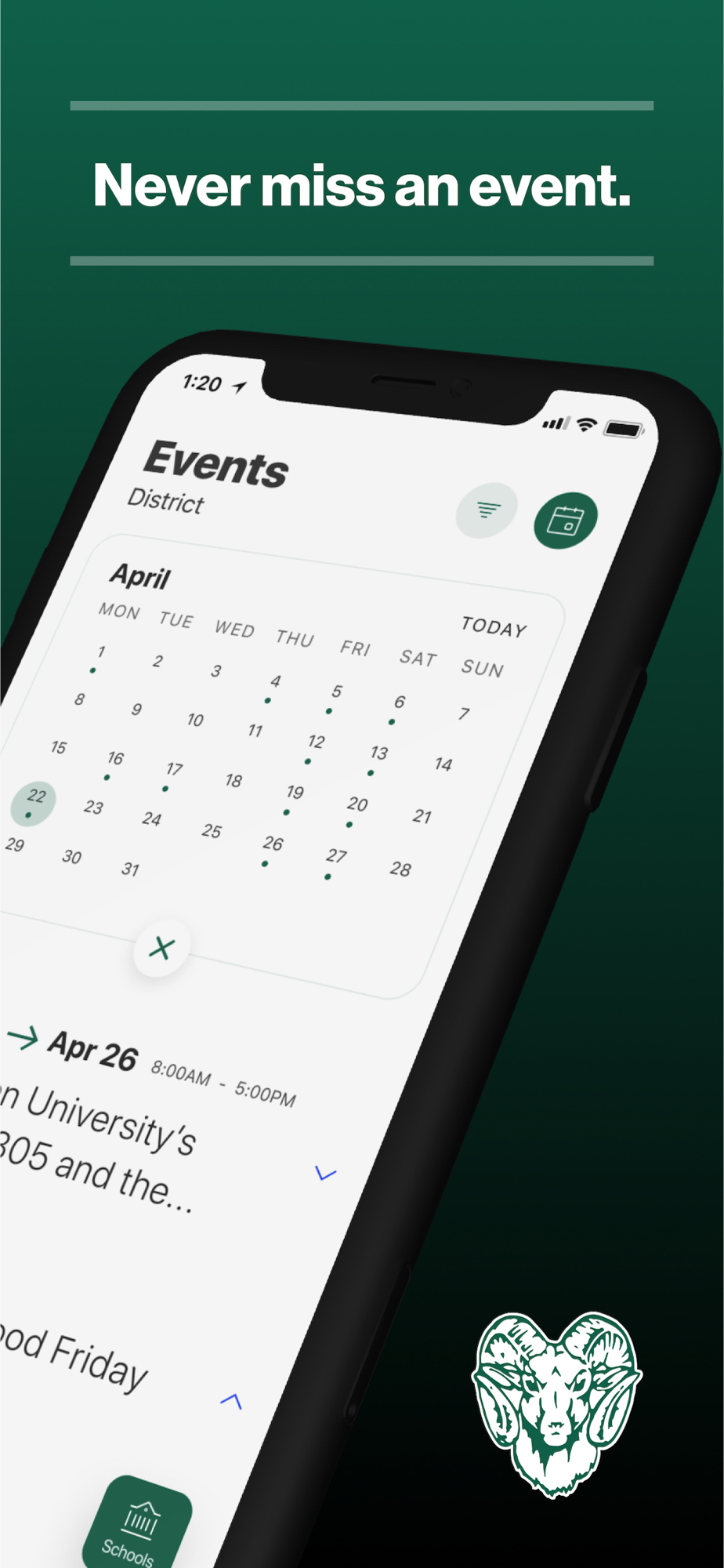 The event section shows a list of events throughout the district. Users can add an event to their calendar to share the event with friends and family with one tap.