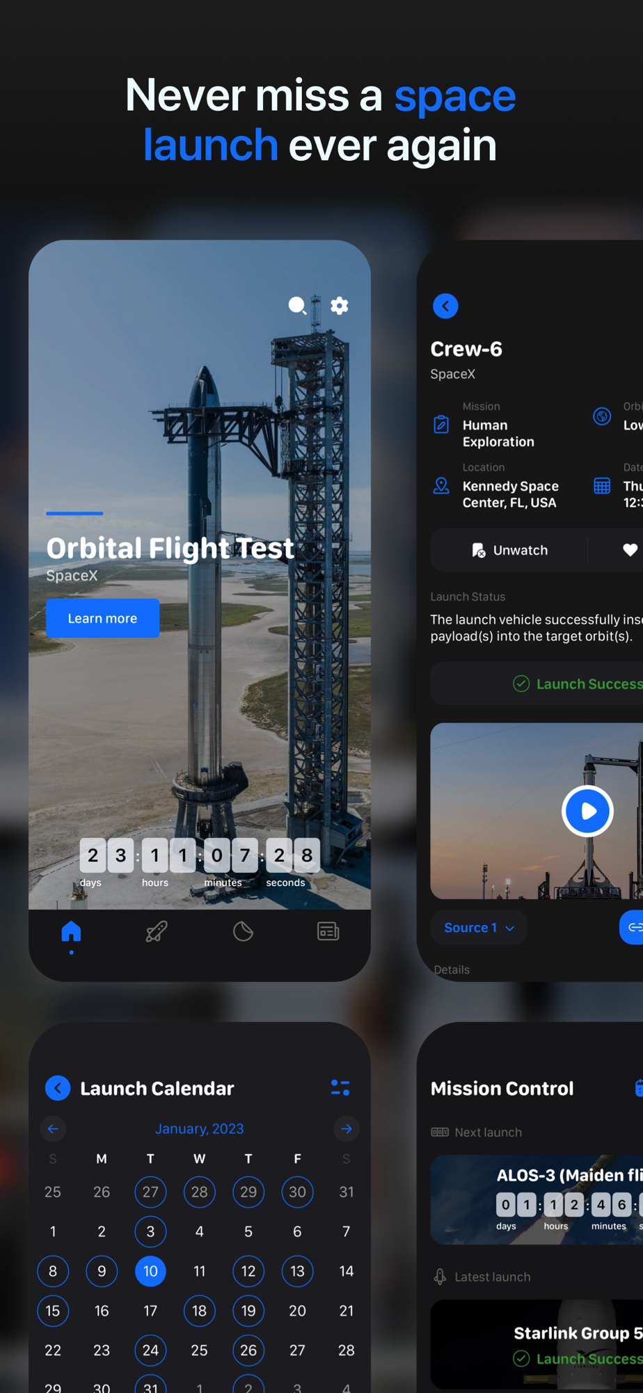 ‣ Push Notifications 24 hours, 1 hour and 10 minutes before every launch so you'll never miss them ever again now with custom controls.