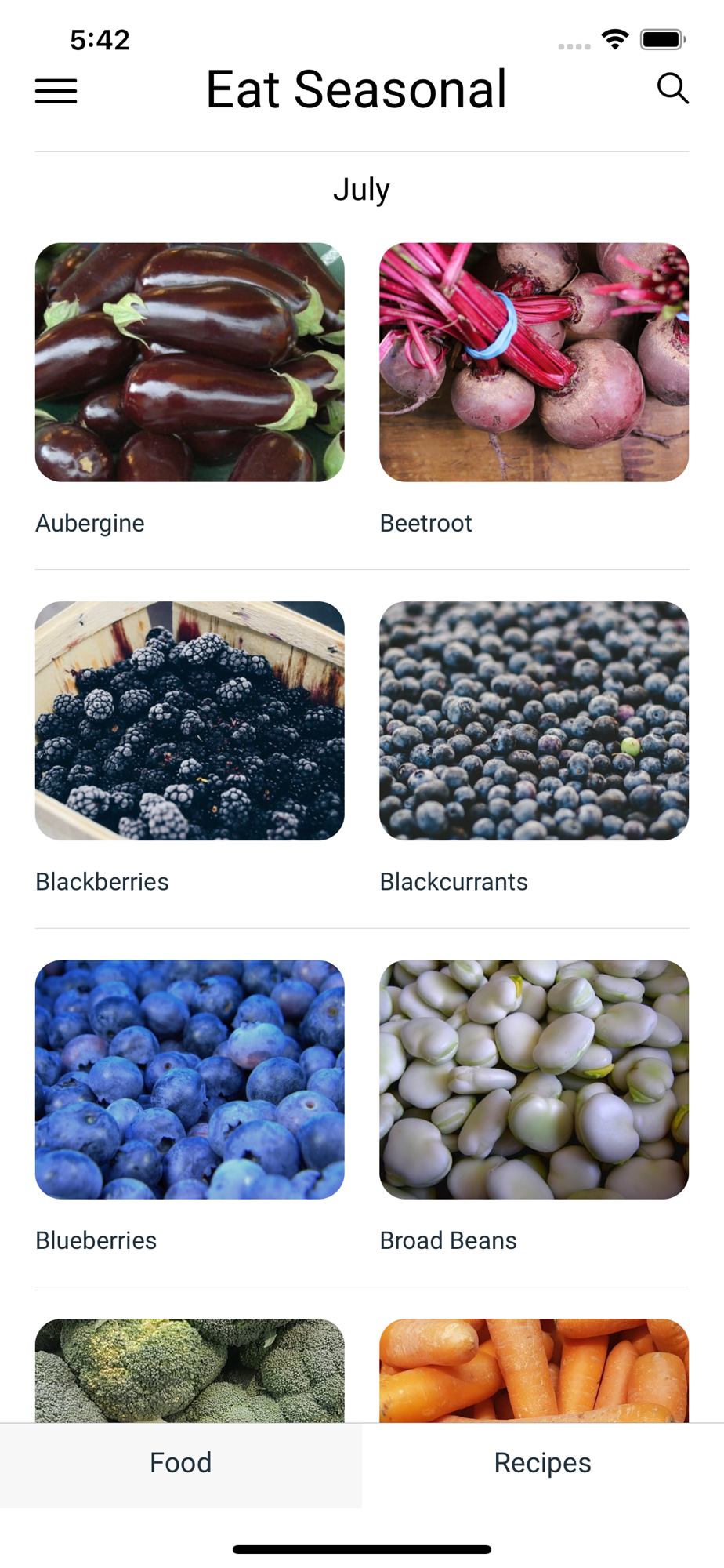 - View all fruit and vegetables currently in season