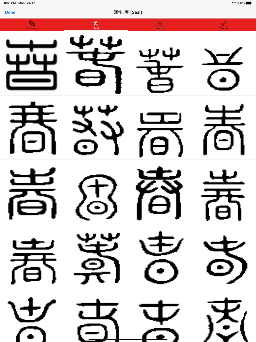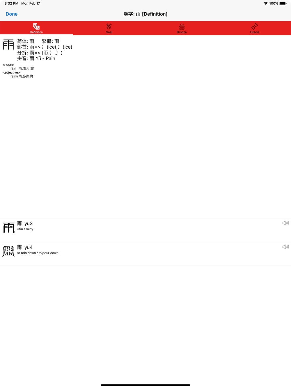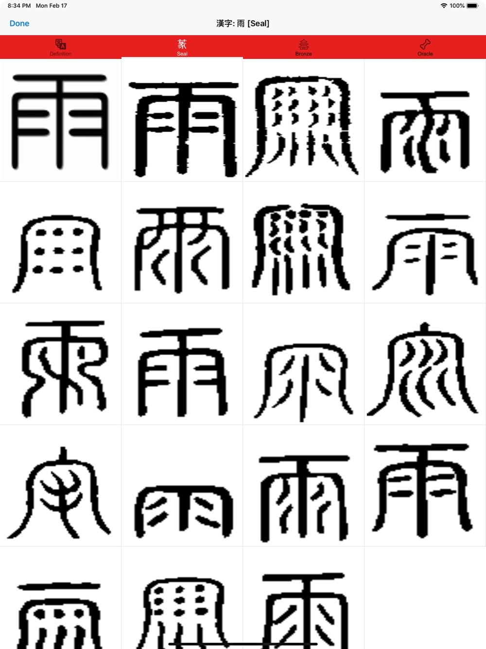 汉字应用是汉字的学习工具。您将通过手机或平板电脑了解有关汉字的更多信息。助您了解汉字的普通话/国语拼音,其含义,发音,书法和词源。同时了解古老的甲骨文,钟鼎文,和篆文等各种字体。