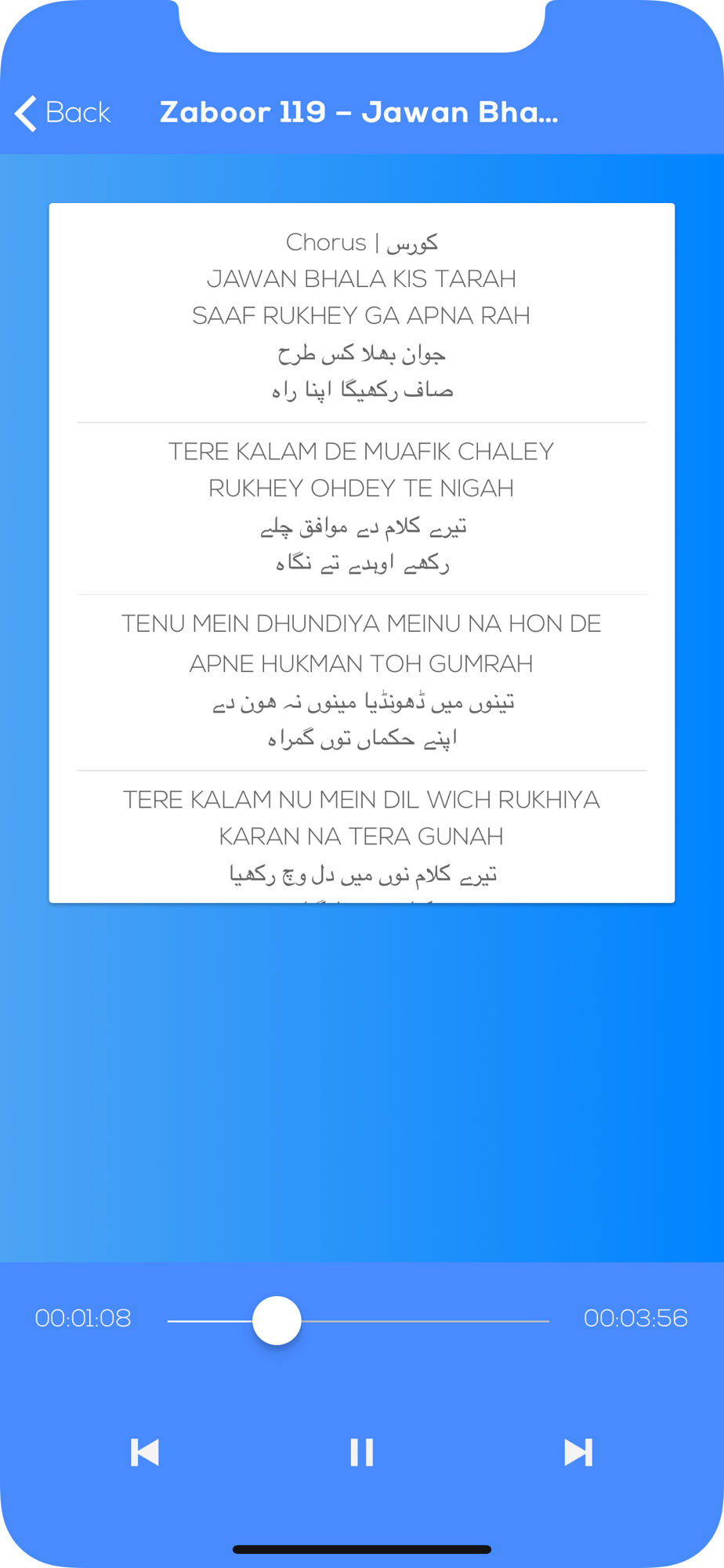 Geet and Zaboor are an essential part of Christian worship service. Geet and Zaboor are a set of traditional worship tunes sung Christians in Pakistan and India. This app provides ease for worshippers to worship word of GOD anywhere anytime. This app makes worshipping more convenient by audio lyrics, easy to understand and verbally audible.