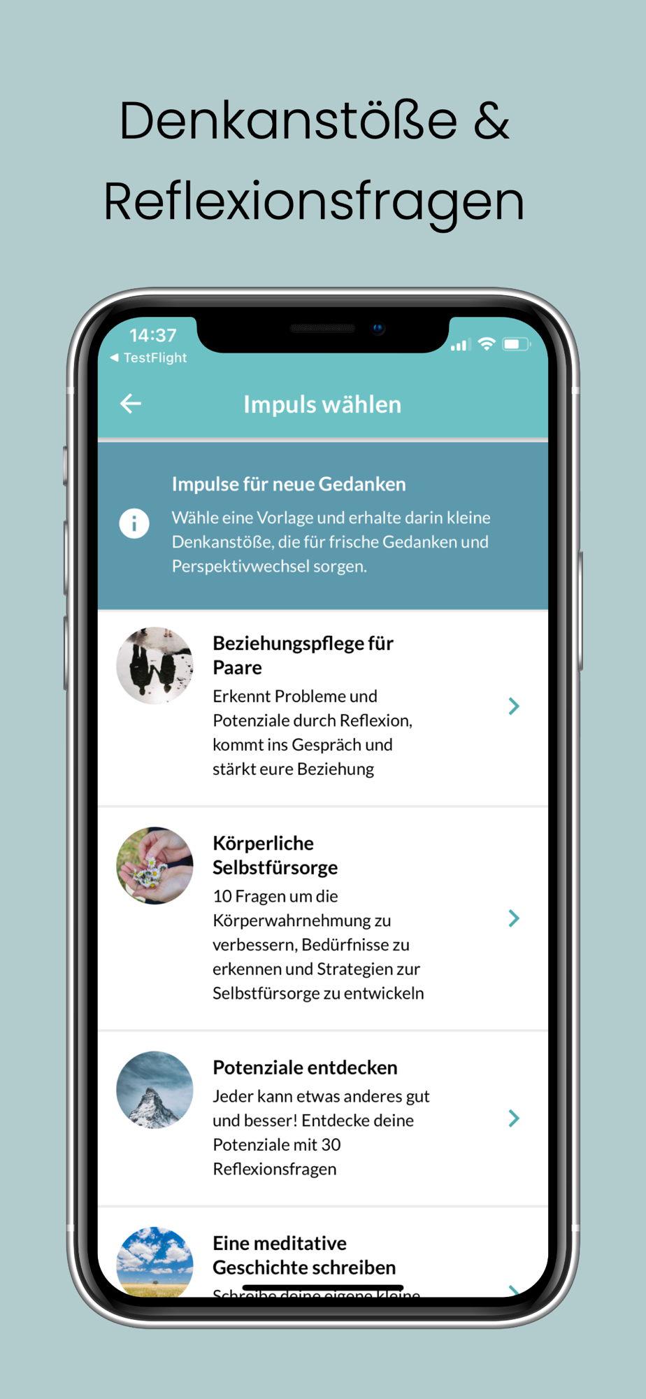 flowgress ist dein Safe Space auf dem Smartphone. Dort gibt es keinen fremden Input, nur dich und deine Gedanken.