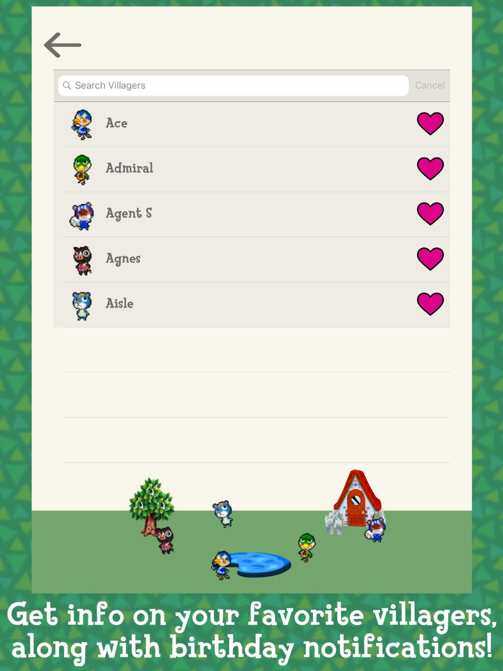 - Get detailed information on any villager that currently exists and favorite them to keep track of which ones live in your village so you can easily check their birthday or their favorite coffee