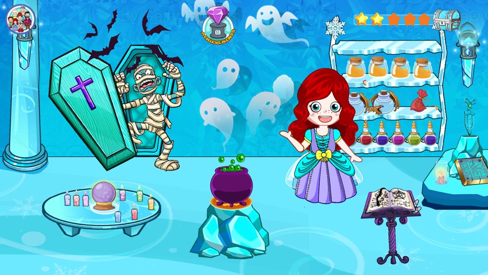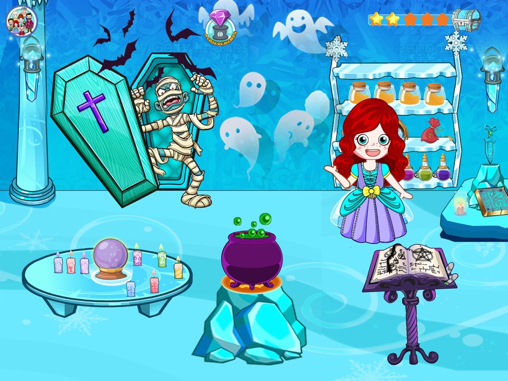 迷你小鎮冰公主城堡遊戲的臥室,廚房,餐廳,花園,走廊甚至博物館,都可以為您帶來不停的冬季公主城堡世界生活娛樂活動。您可以在冰皇后城堡的房間裡做任何事情。您可以享受打掃房間的樂趣,也可以將皇家禮服擺放在櫥櫃中。在這個皇家公主冰鎮遊戲中,您可以播放音樂,並在房間陽台上欣賞城堡的美麗景色。