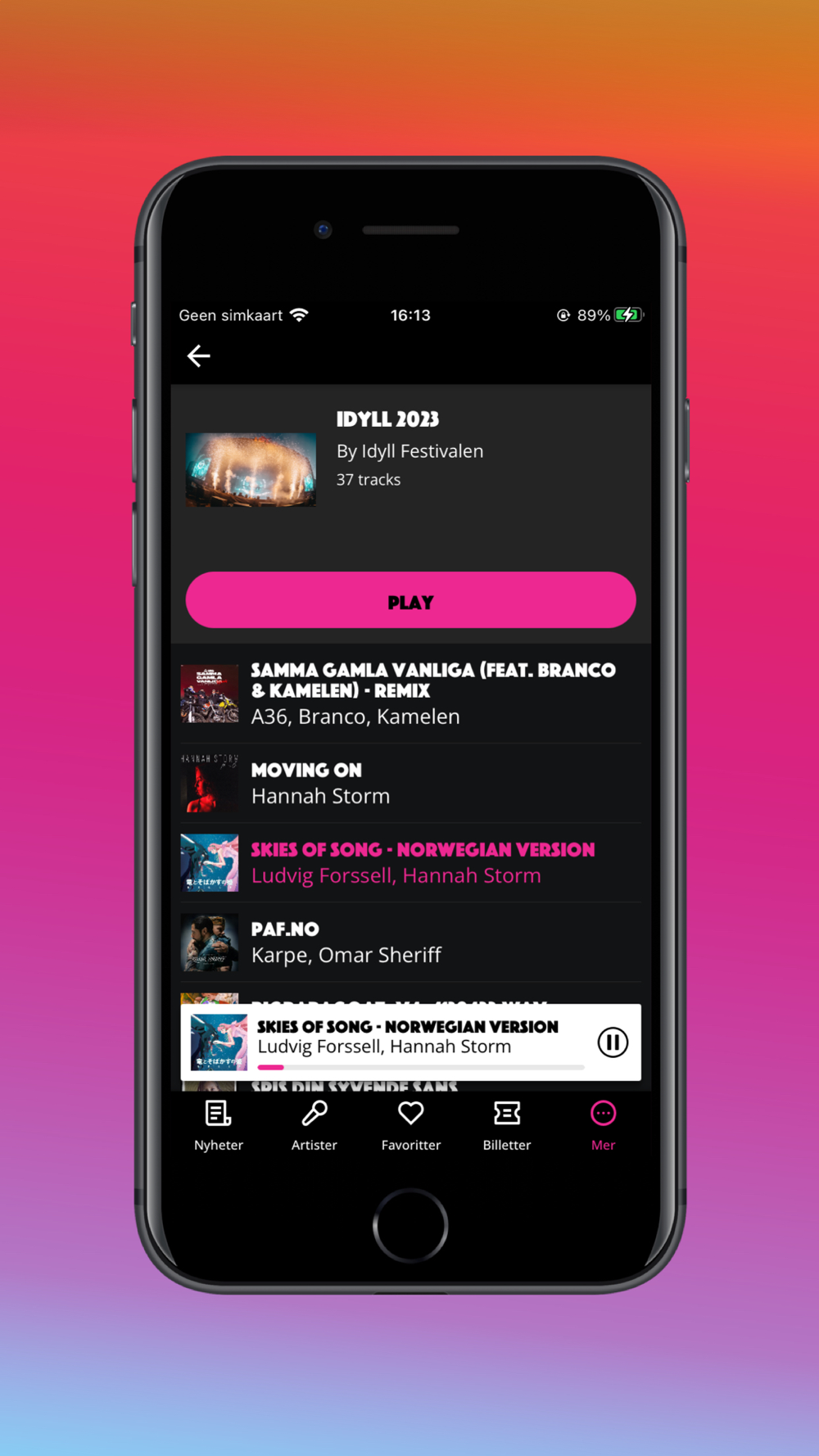 Med Idyllappen får du all praktisk informasjon du trenger for å navigere deg gjennom årets fest i Fredrikstad! Det betyr artistinfo, personlig program, nyheter, kart, den offisielle Idyll-spillelista, og mye mer!