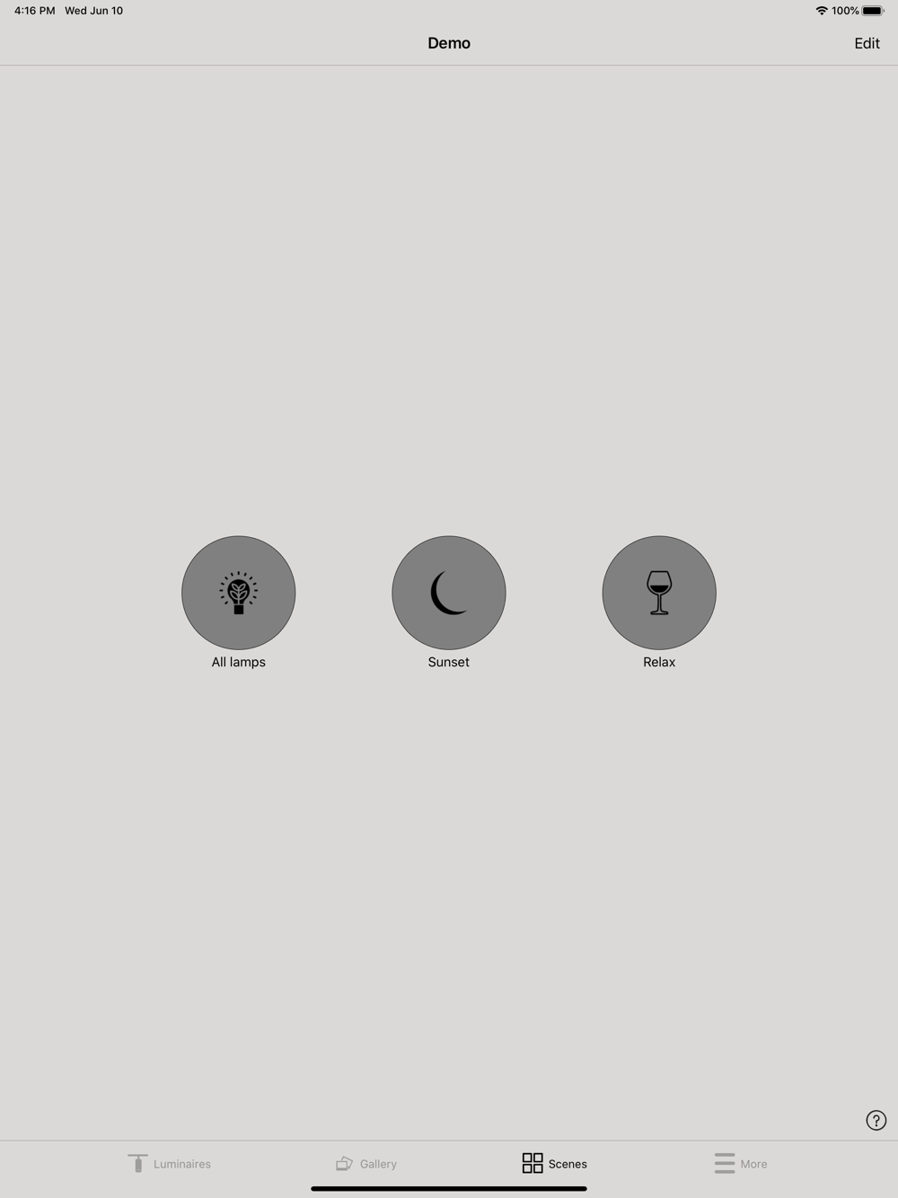 You can create different scenes for different occasions. Set the lights just right for dining, office environments or shop promotions and save the settings in a scene. Now you can change the lighting with one tap for different occasions for example a dinner party or a meeting with a customer.