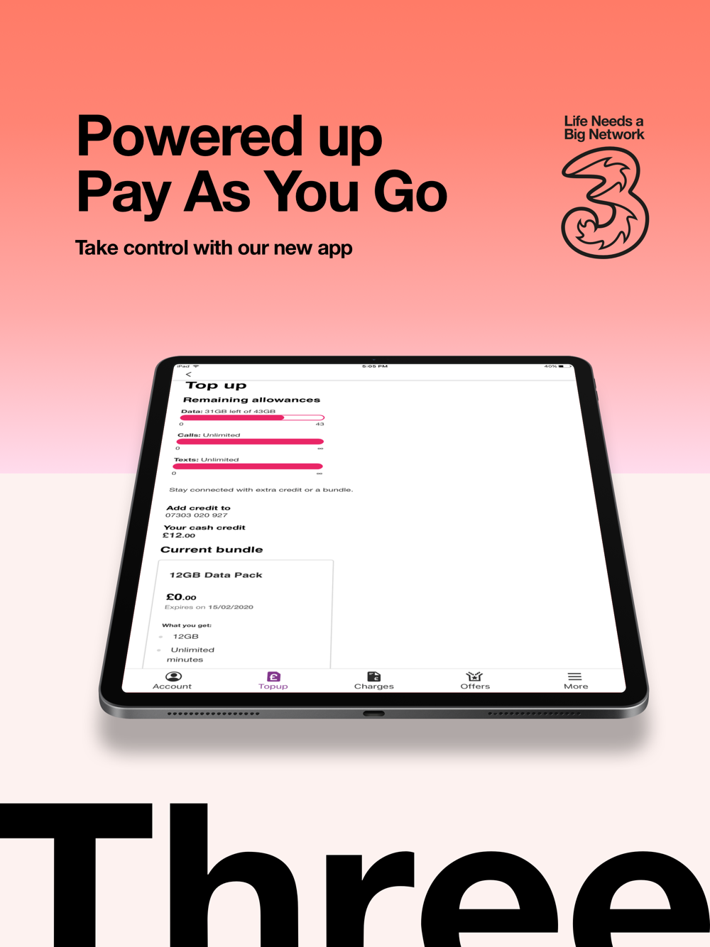 The Three Pay As You Go app will only work if you're on our New Pay As You Go plan, which launched in March 2020. If you're a Pay Monthly customer, or joined on our 321 Pay As You Go plan, you'll need to download the 'Three' app.