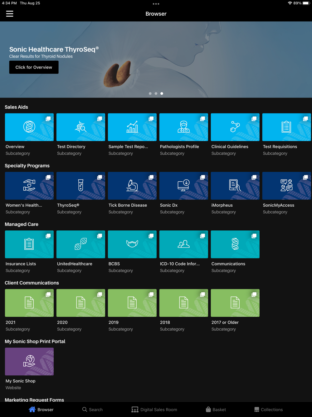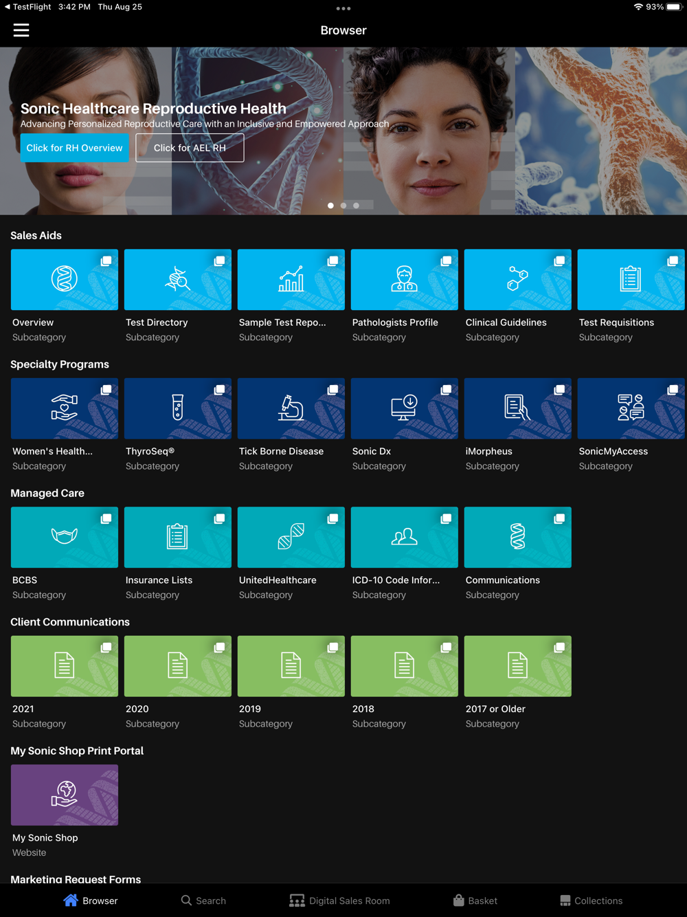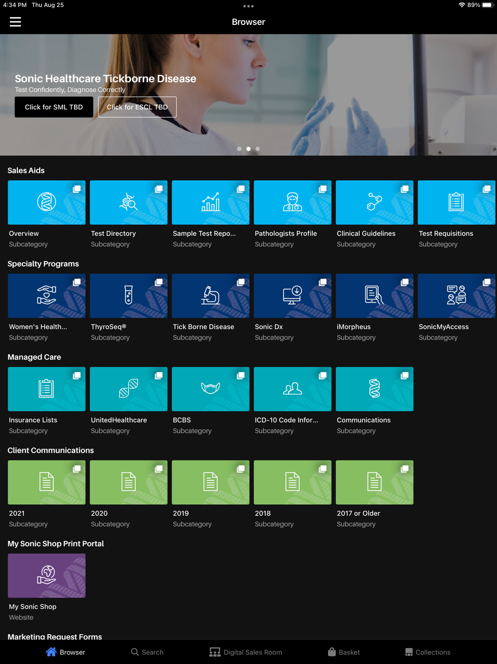 Sonic Healthcare is updating your app experience with a brand new interface! Included in this new update are new capabilities such as adding your most used assets to your Basket, Favoriting content, and creating Collections to share with your customers, along with more new features!