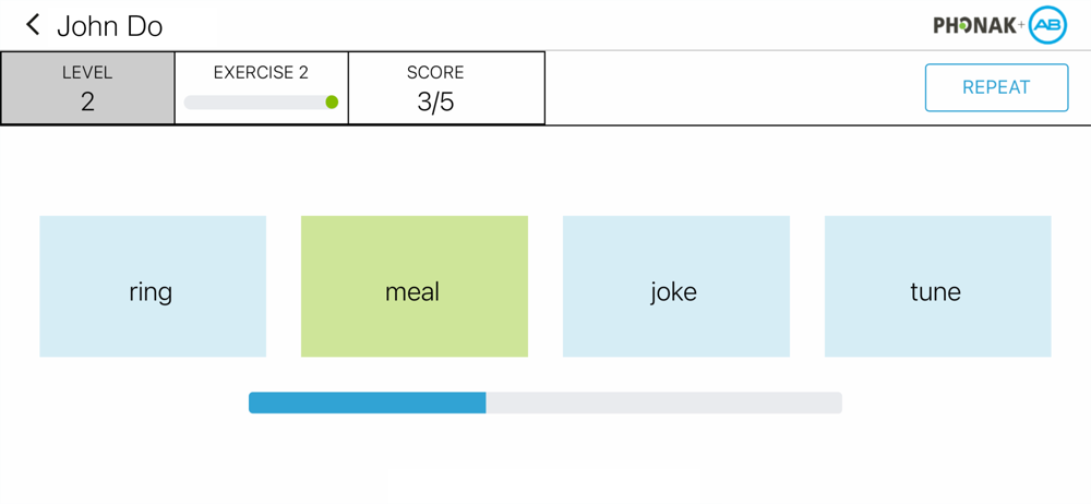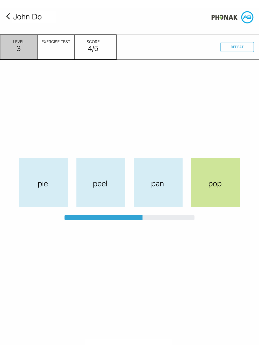 After you take the placement test, the app will suggest areas to visit where you can practice listening for words or words within phrases in a 45-level hierarchy. You can choose to add noise at any time to increase the difficulty.