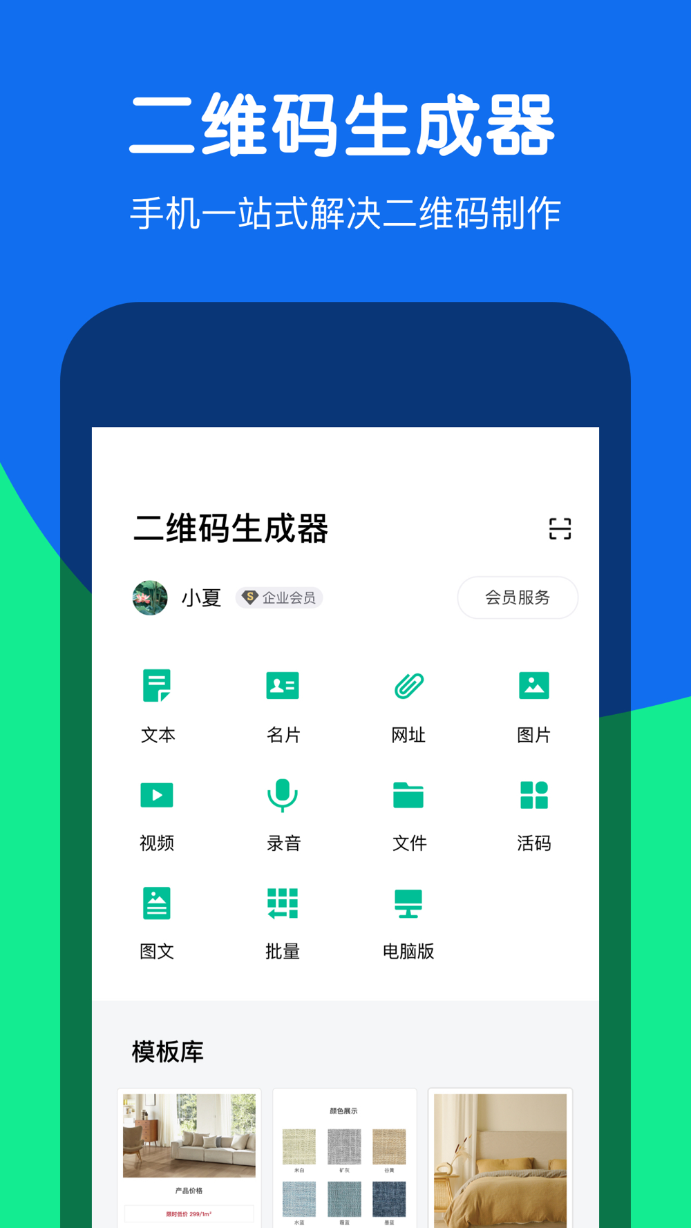 它支持各种多媒体二维码,包括普通文本二维码,名片二维码,网址二维码,图片二维码,视频二维码,录音二维码,文件二维码,活码二维码,图文二维码。