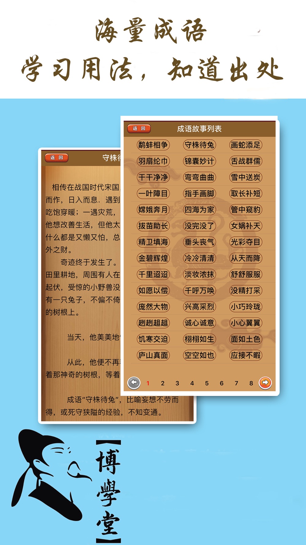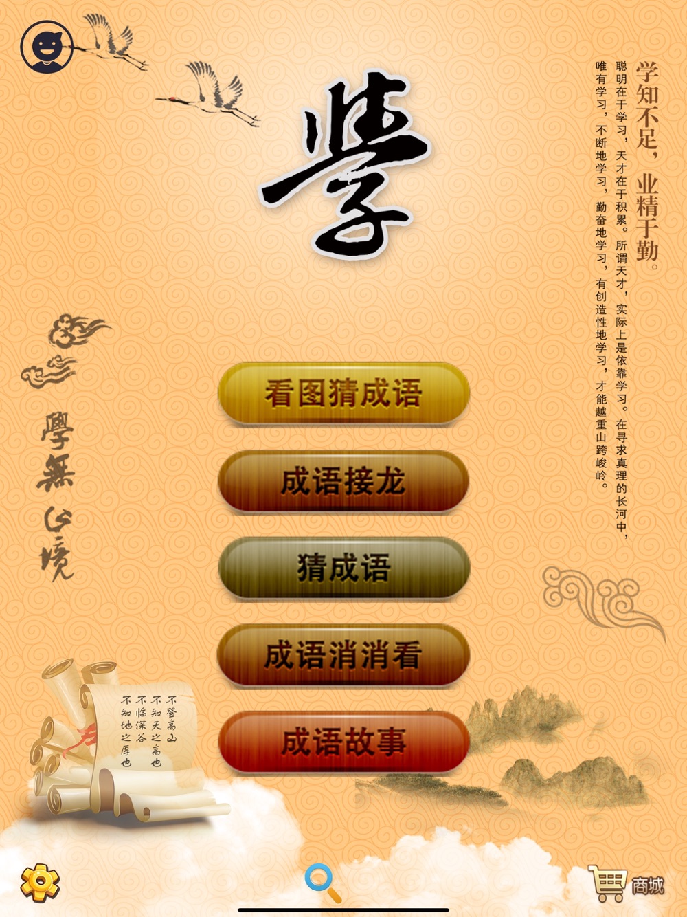 多种学习方法,海量成语,还可以看成语解析出处、成语故事等;同时还提供了在线搜索成语的功能。