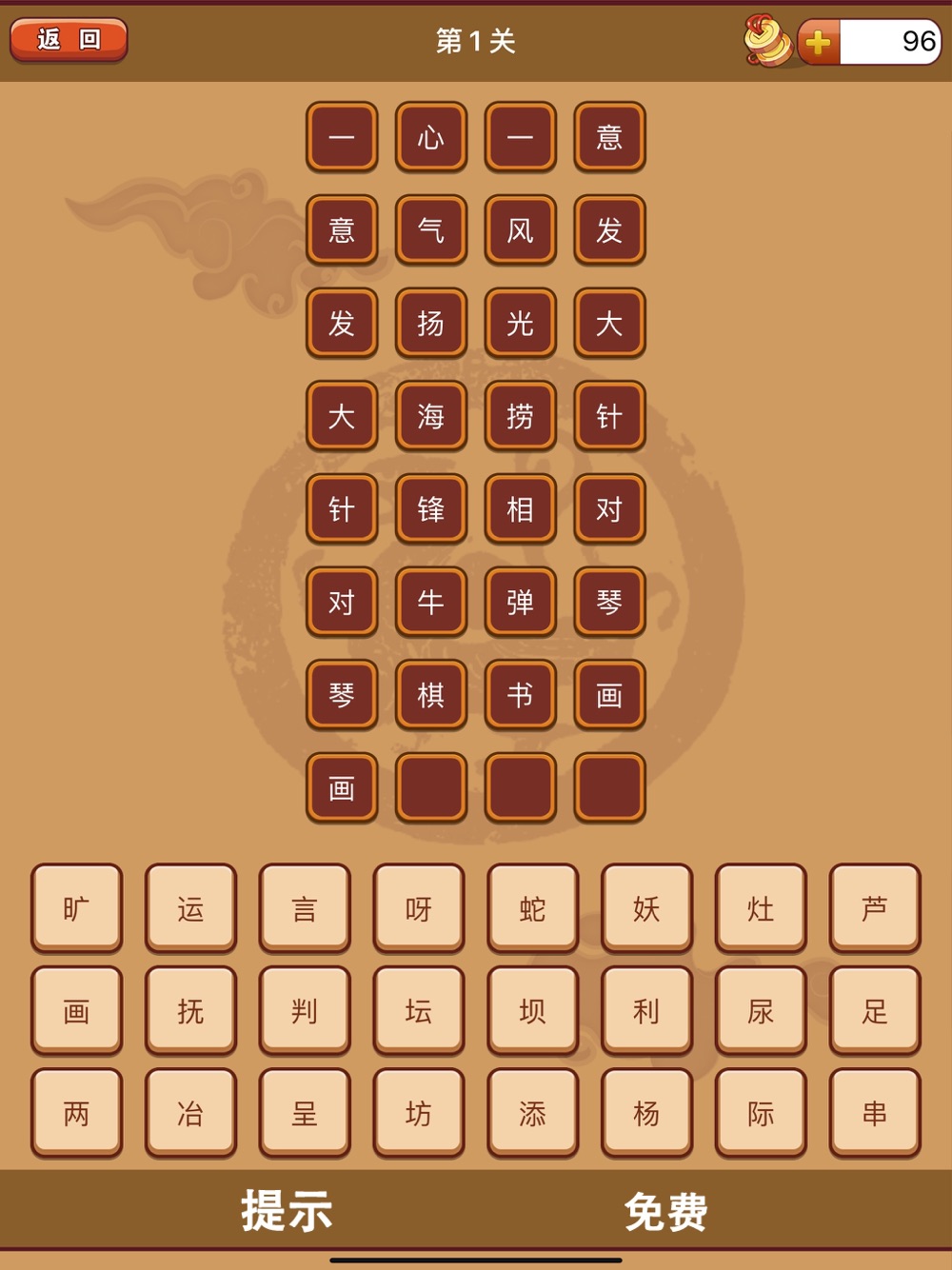 游戏采用图片寓意和成语结合效应,玩家要做的就是在看懂图片表达的成语后,在备选的24个字中选出4个字,要求顺序也正确即可解体,并可以进入下一题。