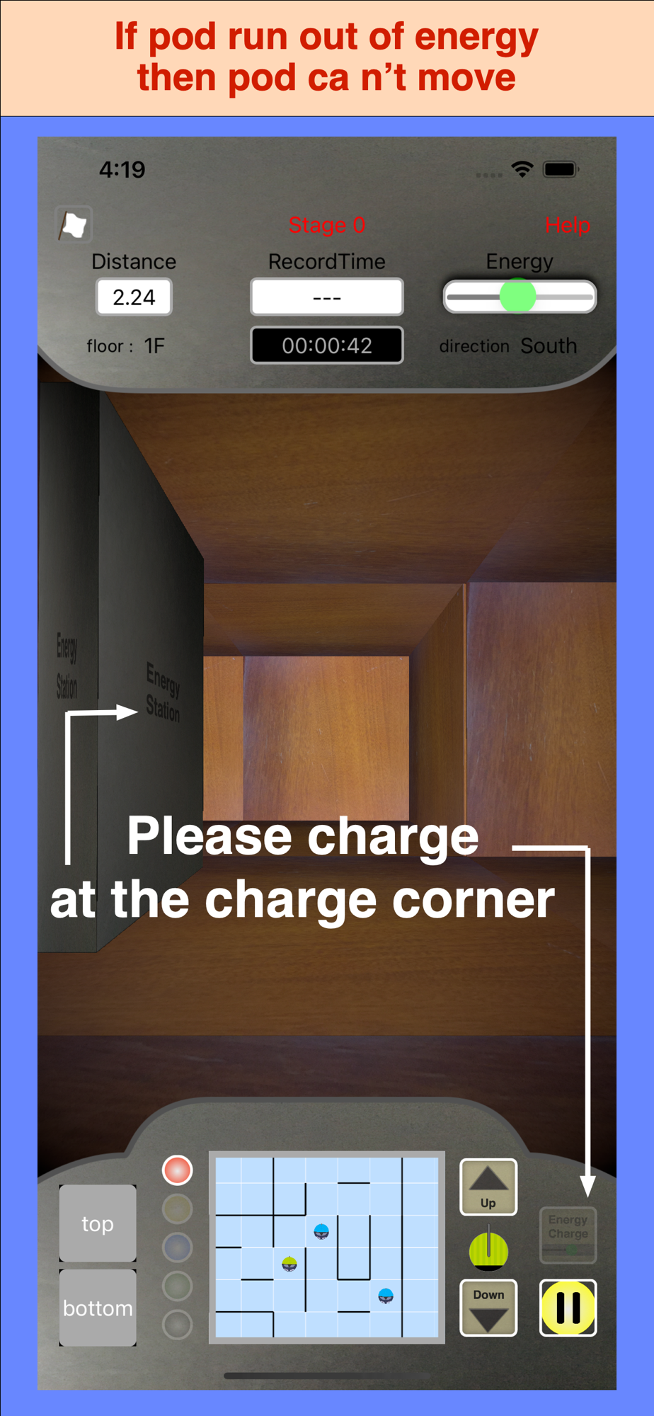 Energy is consumed with each movement. If you run out of energy, the challenge will fail. Make sure to recharge frequently at the charging corner.