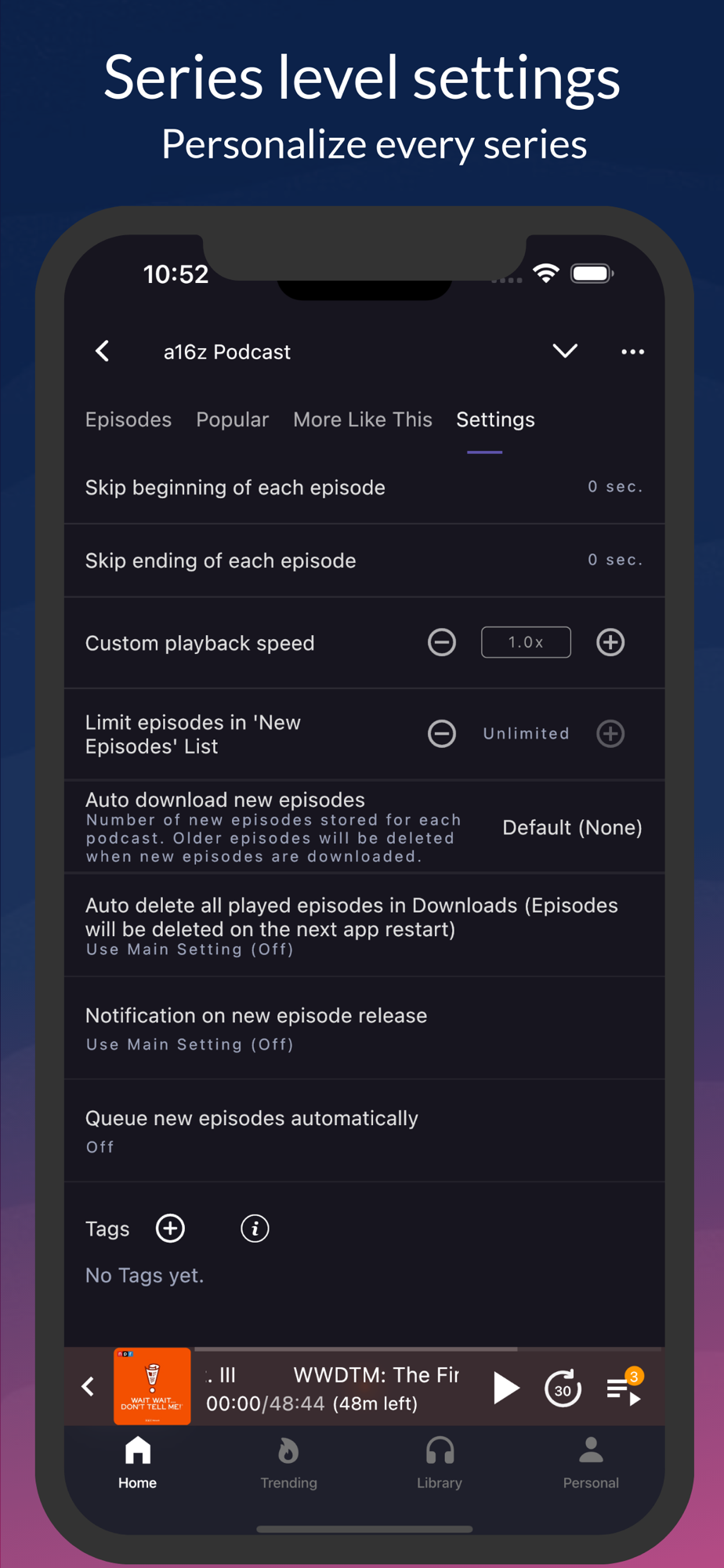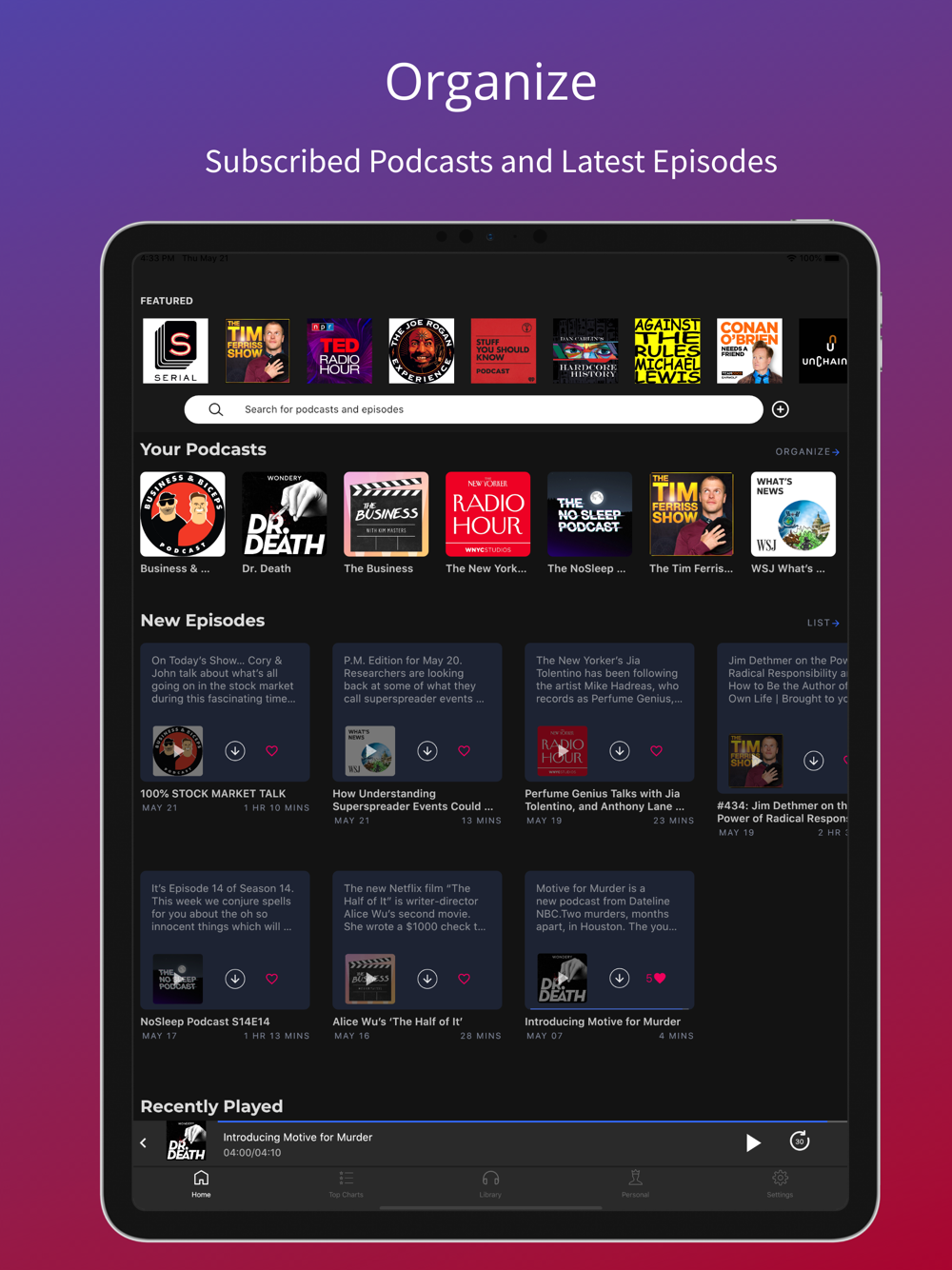 If you listen to many podcasts, we have the best features to organize all your podcasts. They can split based on genres, custom tags and you can view all the recent episodes at once from all your favourite podcasts.