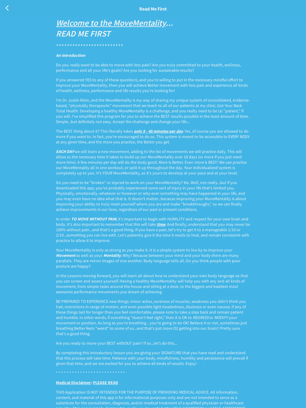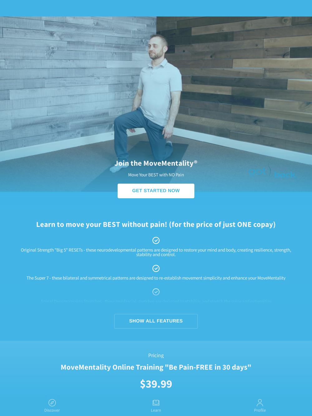 If you download this app today, you will first learn the 3 Key Principles of rediscovering your Original Strength™. If you can include these 3 Keys in everything you do, you will experience noticeable improvements in your life in all kinds of ways. From RESETs for rehab for pain-free movement, to performance enhancement and athletic PR's, to a calmer mind, body and soul, you will appreciate your new and improved MoveMentality if you accept the challenge.