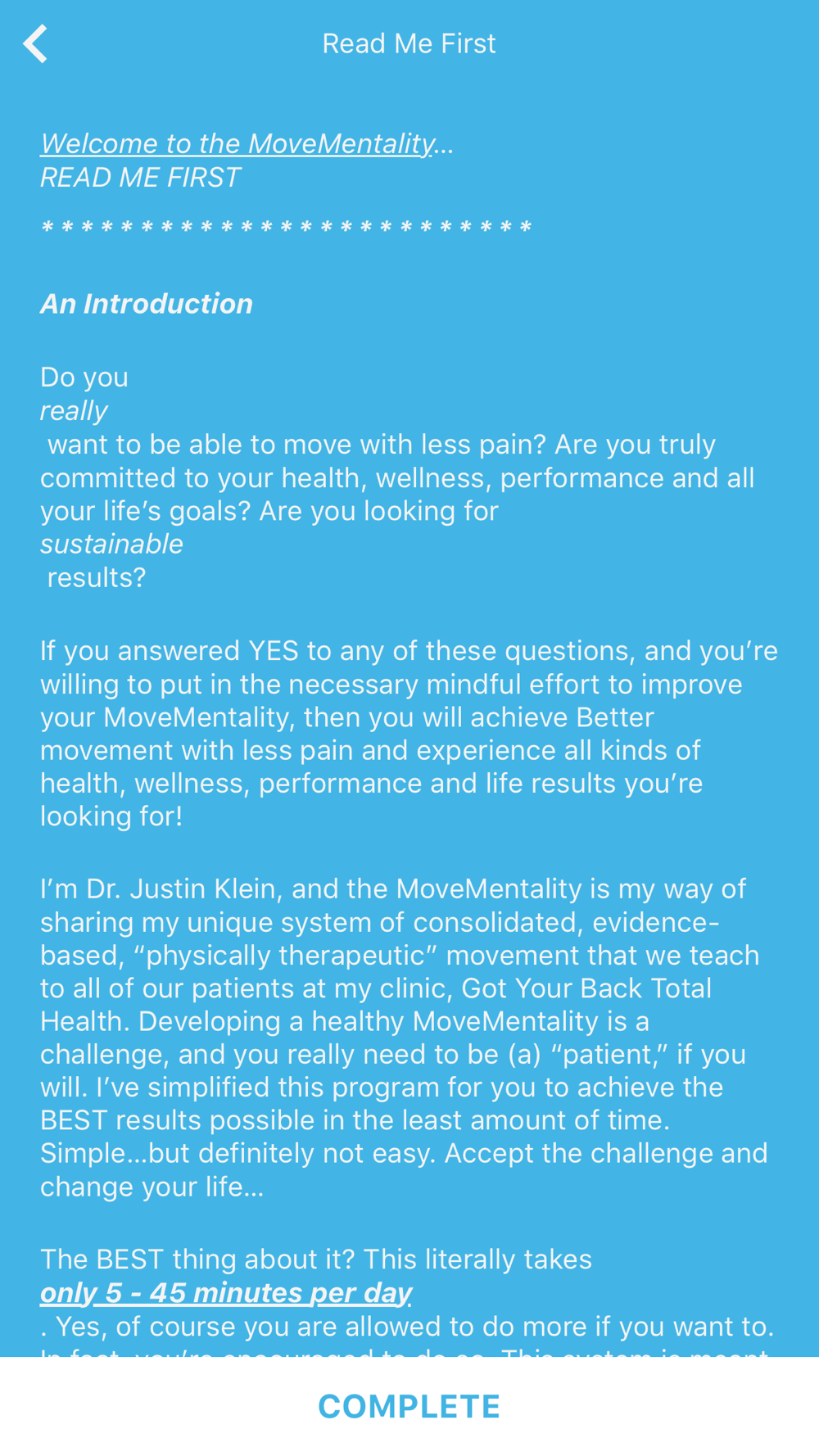 Do you want to move your BEST withOUT pain? Have you been trying to work out but you're afraid of old injuries? Do you want to know more about your own painful, clinical movement issues...and FINALLY make some progress? Are you looking for a movement program that's guided by a doctor who wants you to succeed?! Well, if you said "yes" to any of these questions, then this is the app for you! Join the MoveMentality® and you will learn how to go from good to Better to BEST with your movement, and you'll develop the mentality to continue to do it for life...withOUT pain.