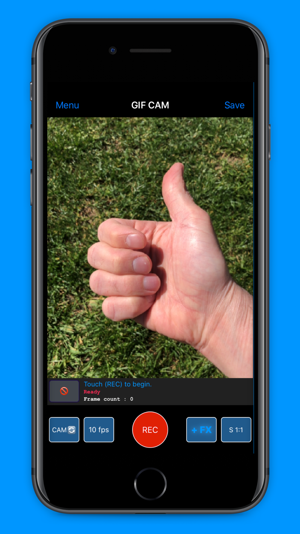 GIF FX gives you full control over fps (frames per second captured from your camera feed) and frame delay speed. Using these two settings you can create fun slow motion GIFs and super speed time-lapse style GIFs.