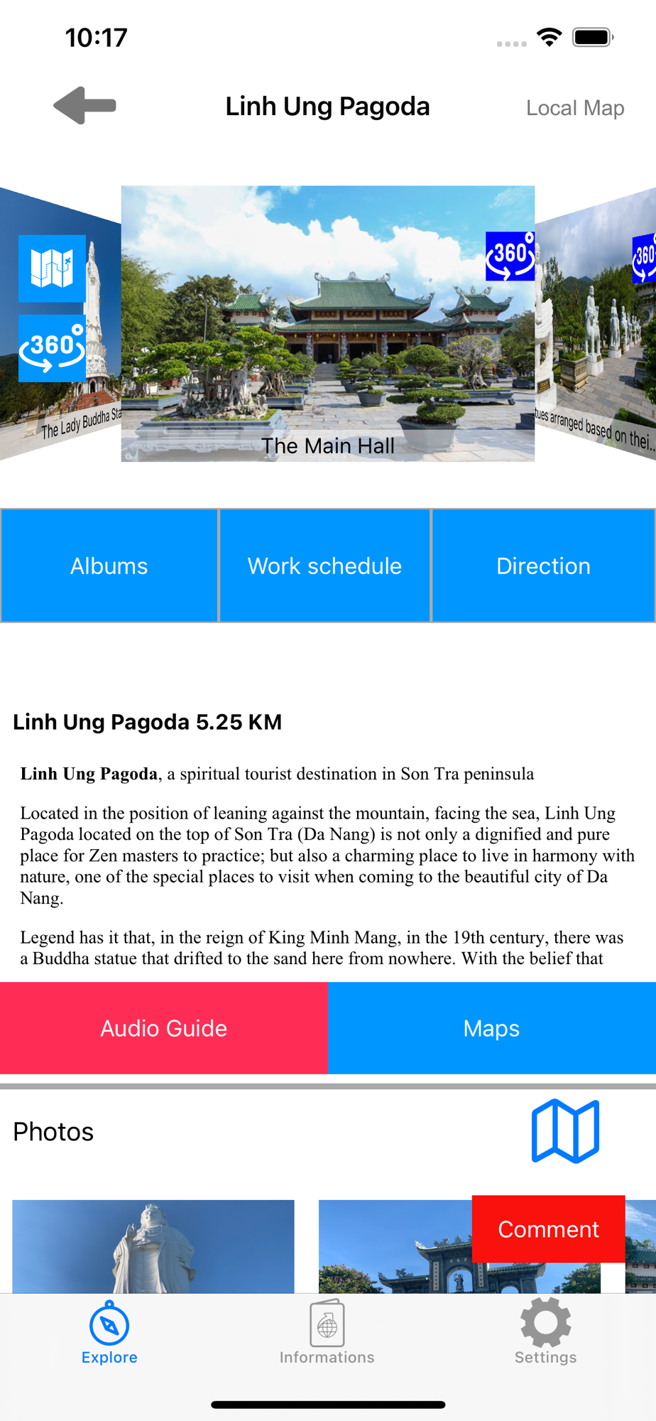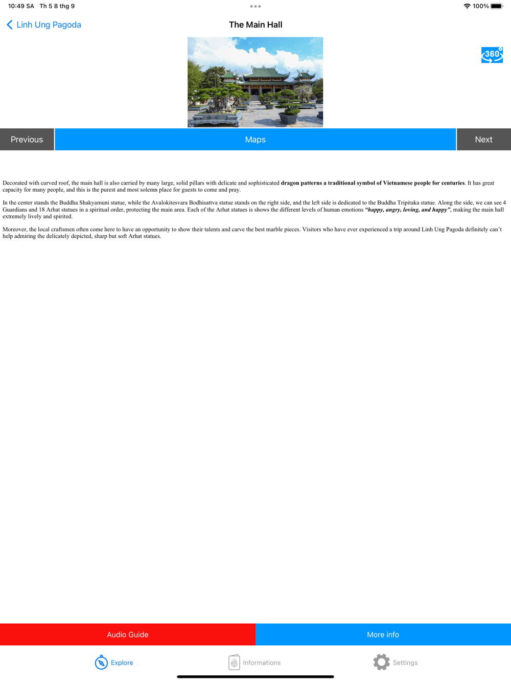 The main feature is to introduce tourist attractions by audio guide, sightseeing map, pictures, Vr Tour, 360-degree photos to attract tourists.
