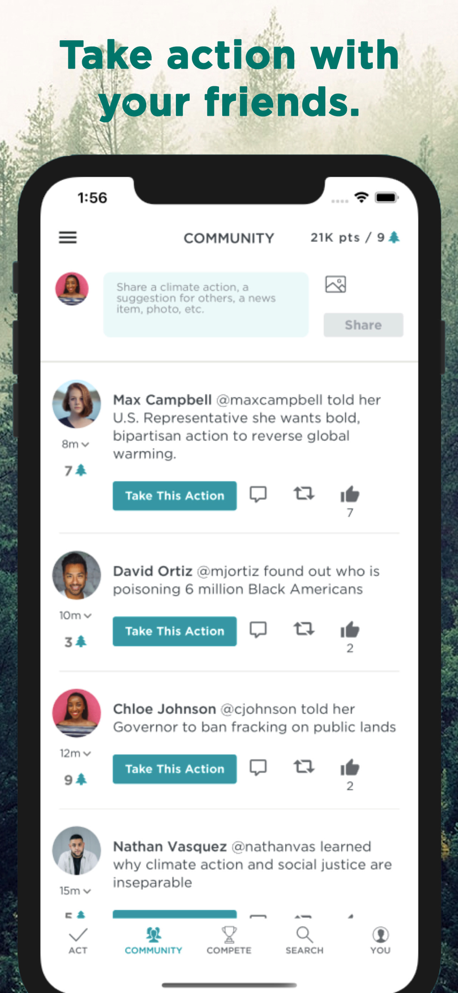 Did you know that leading climate activists say the most important thing you can do about climate change is to talk about it? Every action you take with Climate Action Now is automatically posted to the app's Community Feed where people can see it, take that action also, comment on it, like it, and share it with others.