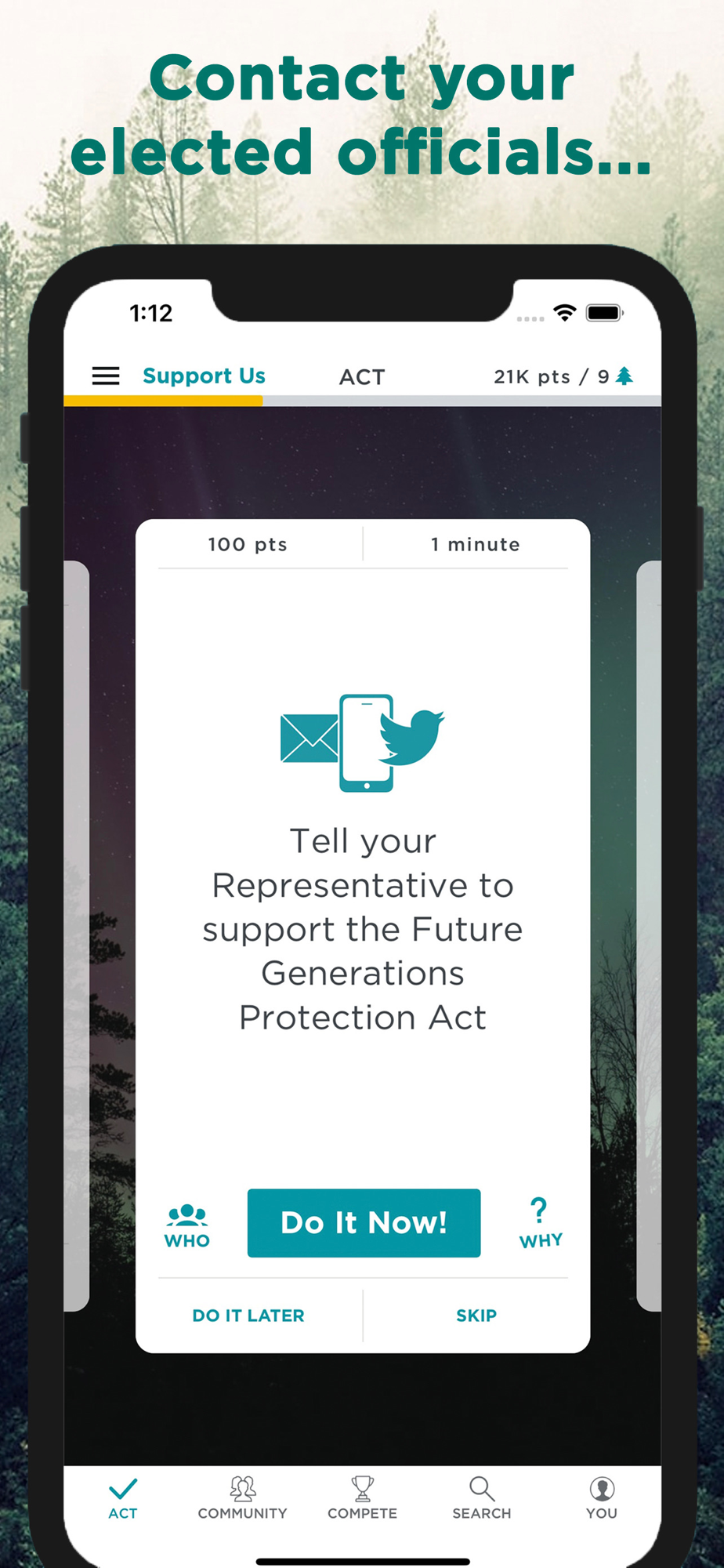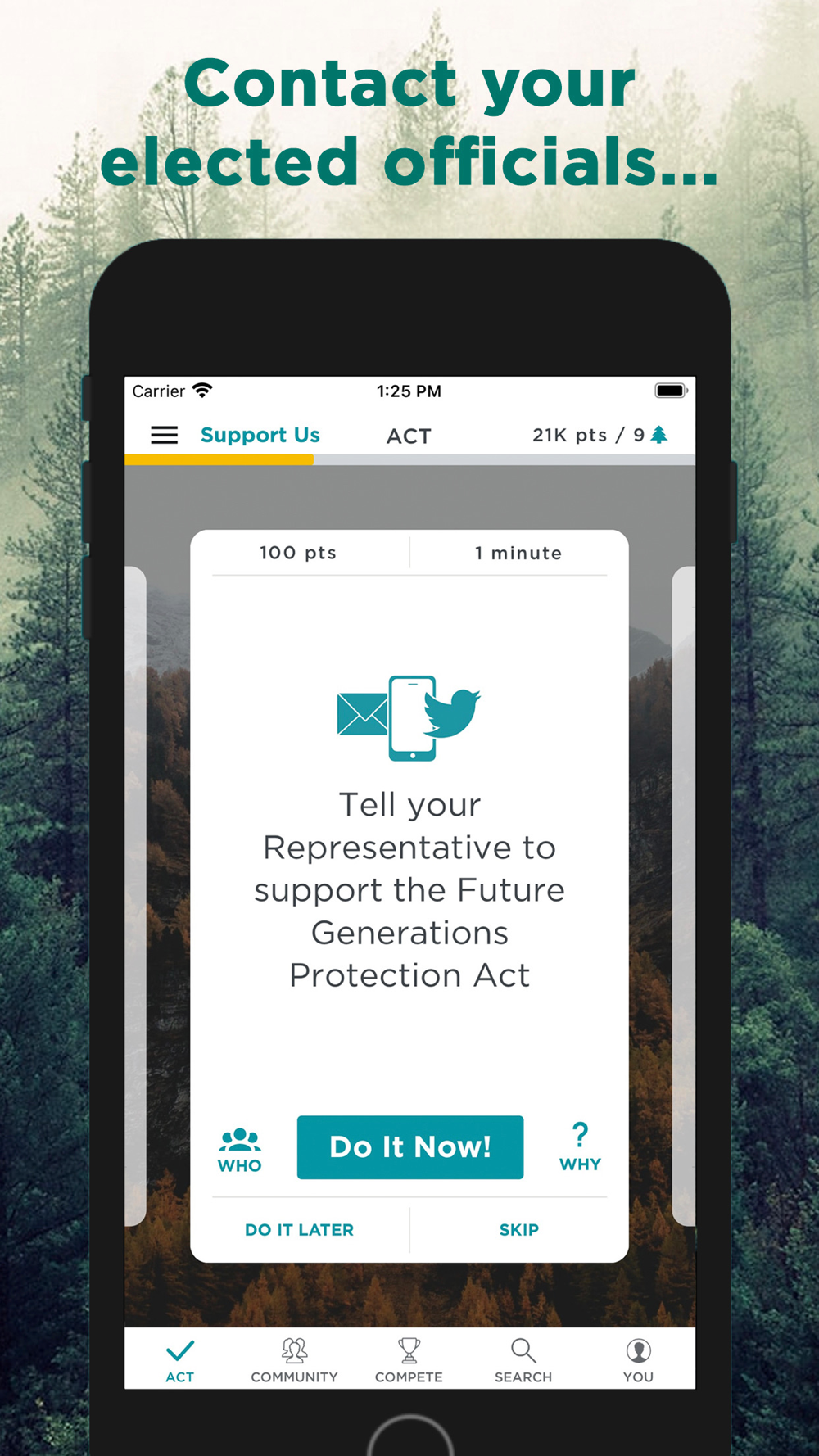 This app does the work so that you don’t have to. It provides an endless stream of well-researched, well-written, personalized messages that you can send to political and business leaders advocating for climate action in just seconds with just a few touches! And you’ll learn a lot about the issues and earn real trees as you go.
