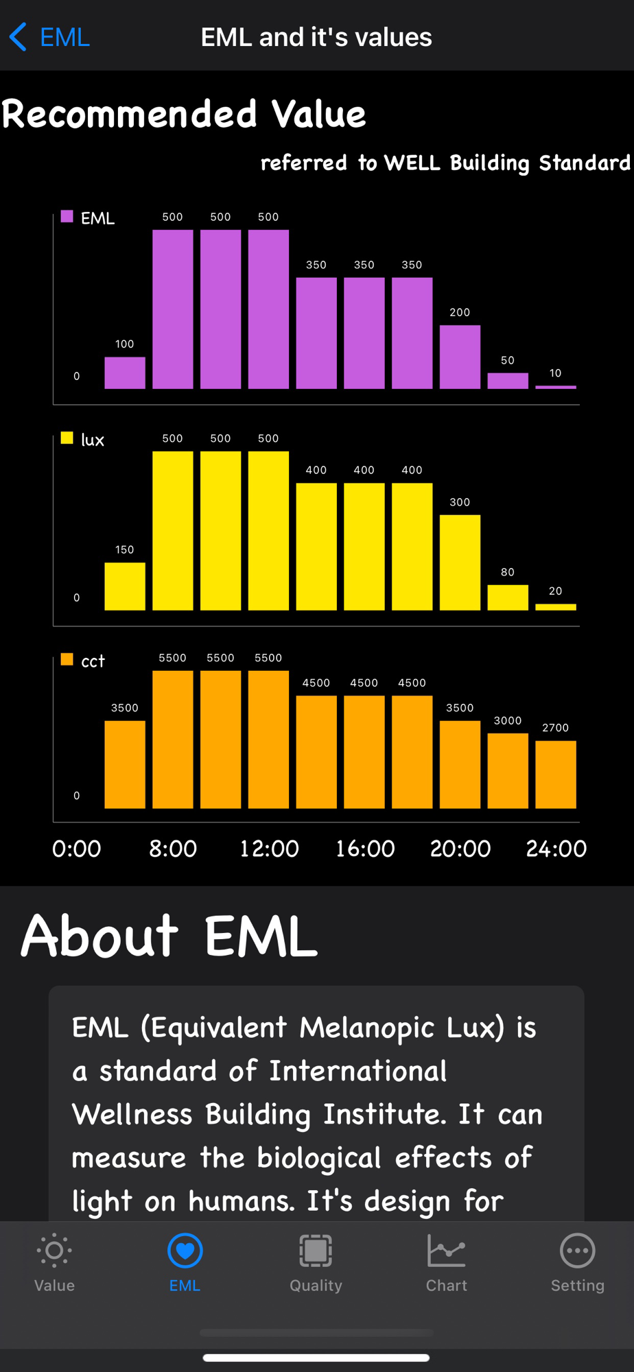 - Lighting scenes recommendation with Equivalent Melanopic Lux (EML), lux and CCT.