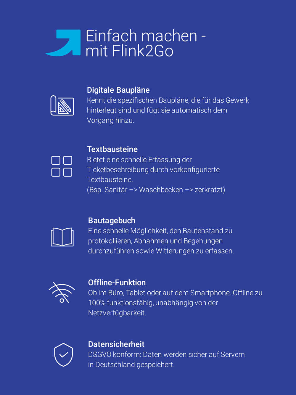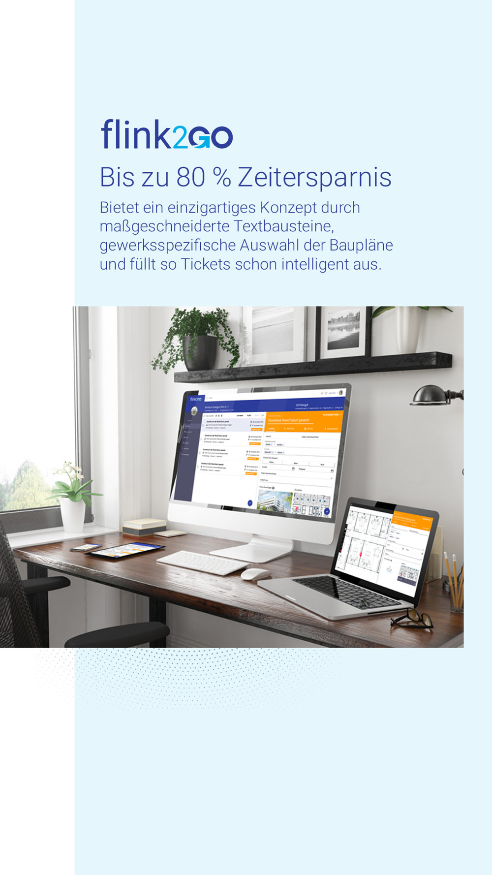 gewerksspezifisch zur Auswahl zu stellen und Eingaben intelligent vorauszufüllen, wird der Zeitaufwand mit Flink2Go um bis zu 80% reduziert!
