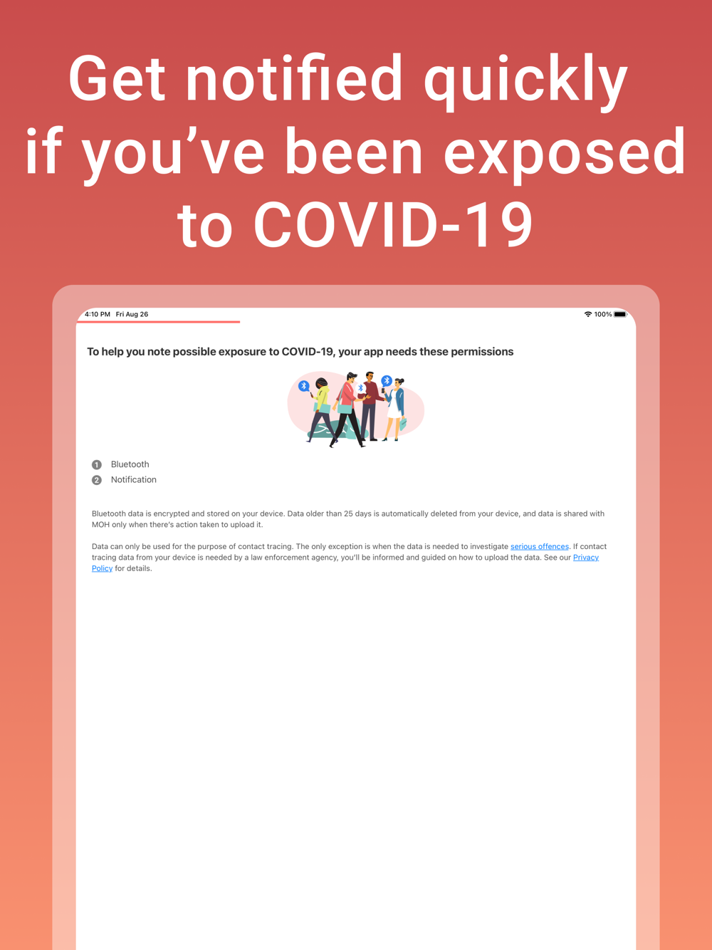 The app uses Bluetooth, and your Bluetooth data is stored securely on your phone. It’ll be shared with MOH if you test positive for COVID-19, for the purpose of contact tracing. Also, all Bluetooth data stored on your phone is automatically deleted after 25 days.