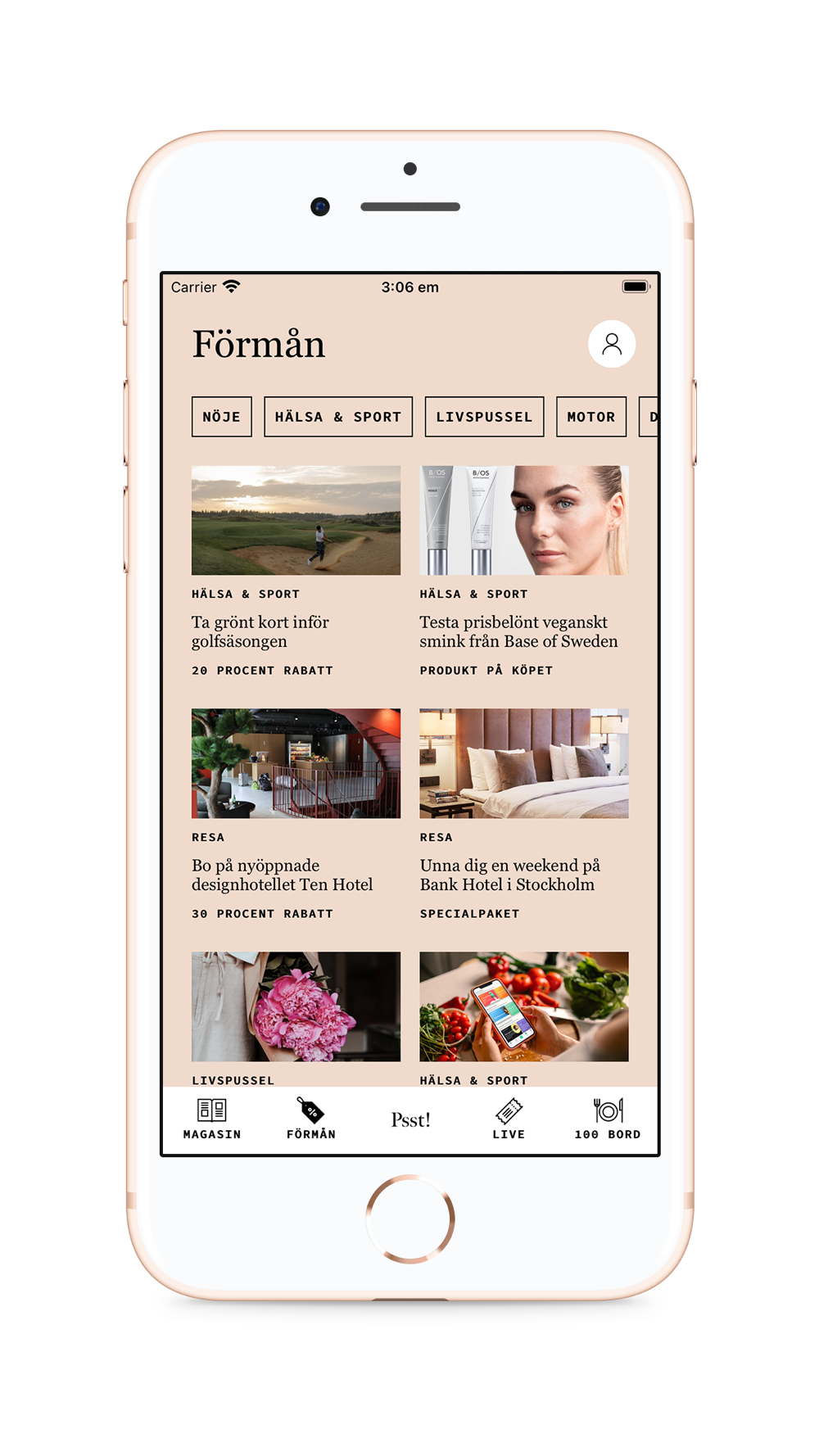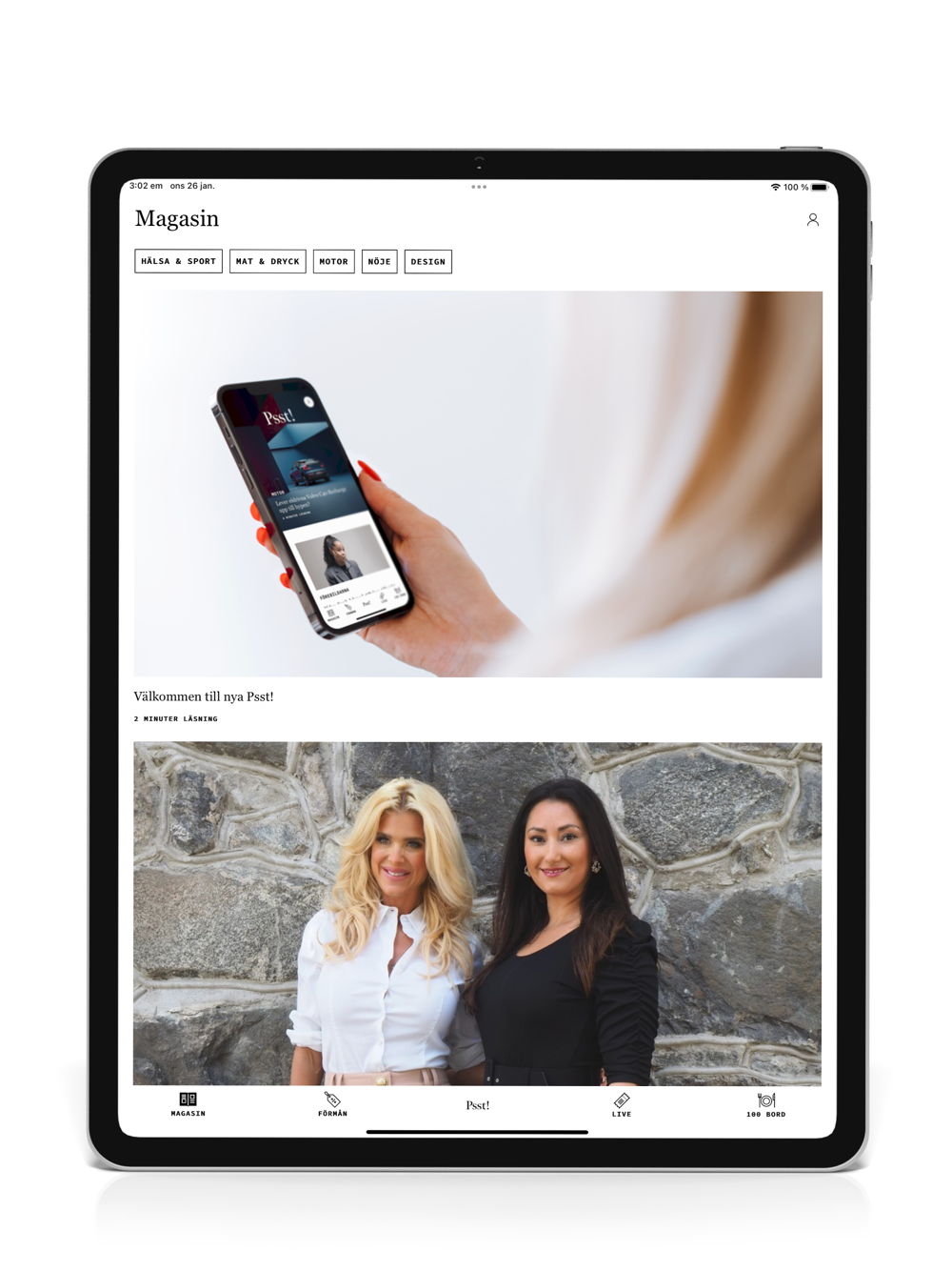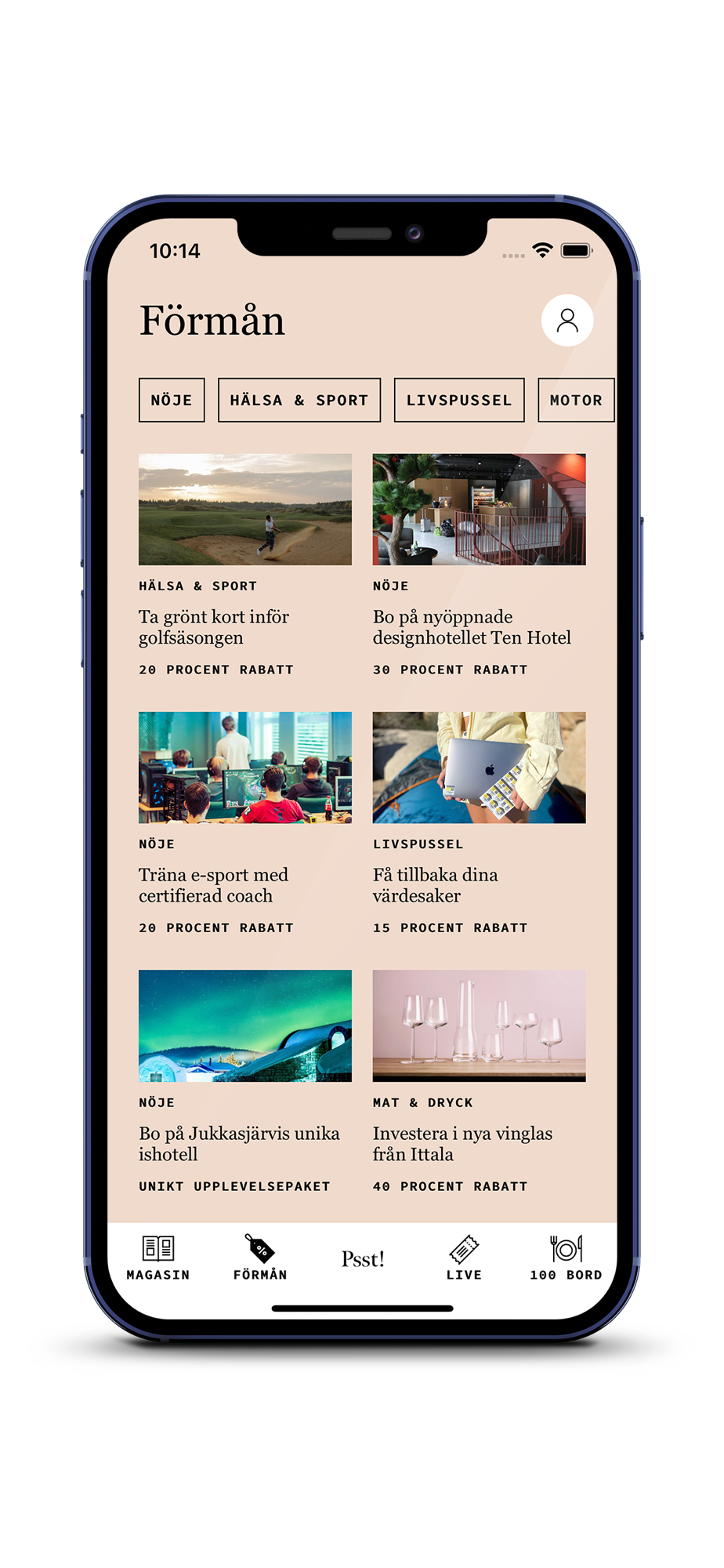 Psst! är förmåner och inspiration direkt i mobilen för dig som är privatkund i Handelsbanken. Innehållet publiceras regelbundet och är en blandning av erbjudanden och artiklar. Via inspirerande och informerande uppdateringar erbjuds du exempelvis förköp av VIP-biljetter till liveevenemang och guidande artiklar om de senaste elbilarna, den godaste vegetariska maten och de mest avslappnande träningsövningarna. Psst! vill förenkla och förgylla på ett hållbart sätt.