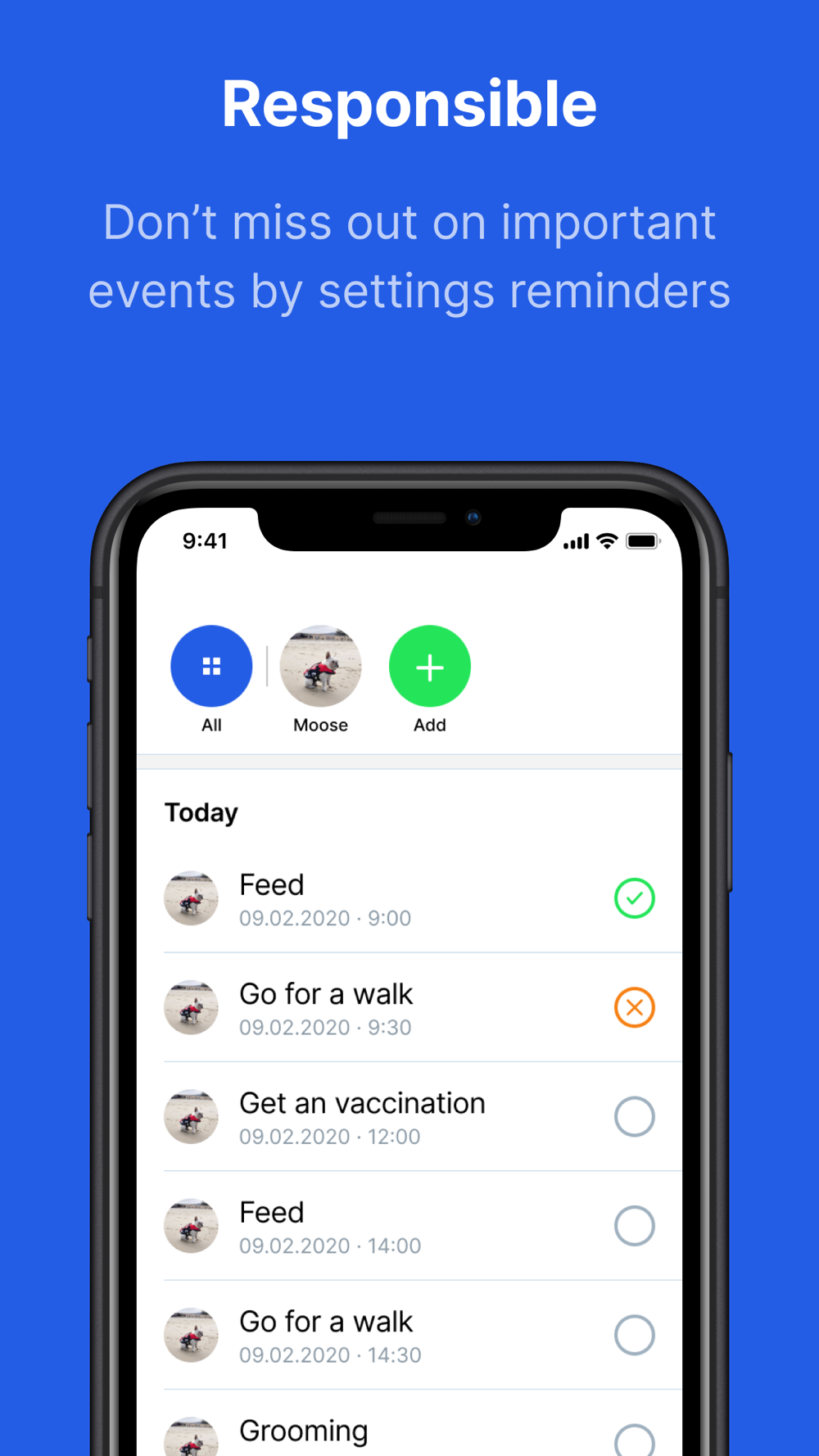 You think about your pet every day. And it's important not to miss out on many different things: feeding, walking, combing, visiting the vet, changing the water in the aquarium. If you want to keep up with everything, without losing your pet's documents and save memorable moments spend together - our app is for you!