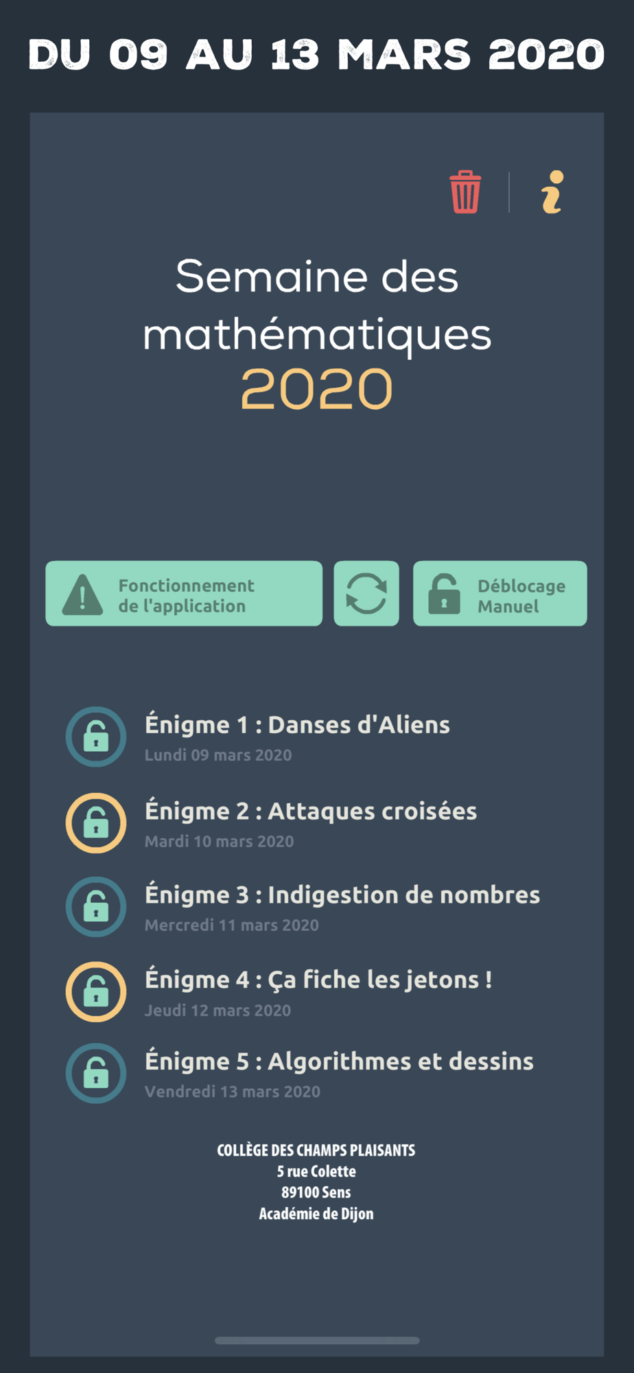 Les énigmes sont disponibles à partir du 9 mars 2020. Chaque jour, dès minuit, l'énigme quotidienne est déverrouillée et peut alors être résolue. Chaque énigme comporte trois niveaux de difficulté croissante. En général, le niveau 1 est facile et permet de saisir les manipulations à effectuer. Le niveau 3 est difficile pour des élèves de primaire, qui pourront le plus souvent résoudre le niveau 2.