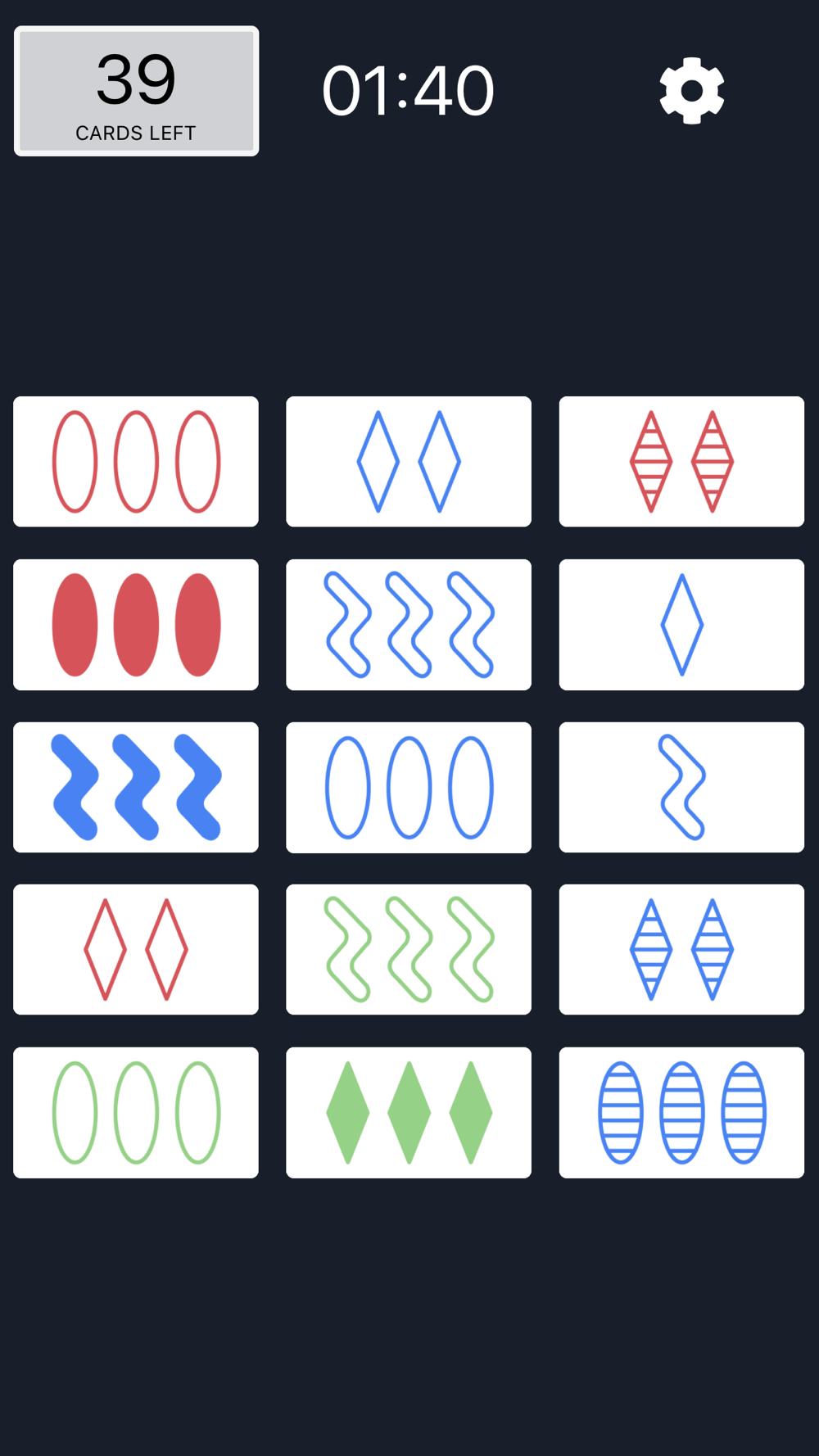 Group is a challenging game designed to engage the pattern recognition part of your brain. Gameplay is simple: select a set of three cards which, for each of four attributes (color, shape, count, fill), all the cards in the set match or differ. Check out the screen shots for some examples.