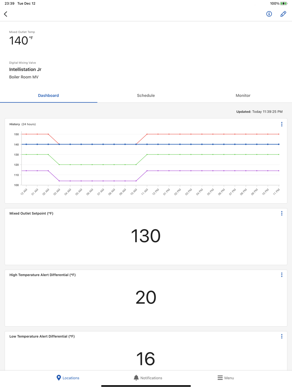 - Dashboard includes status of all heating calls, sensor inputs, outputs and special conditions, and boiler run time and cycles