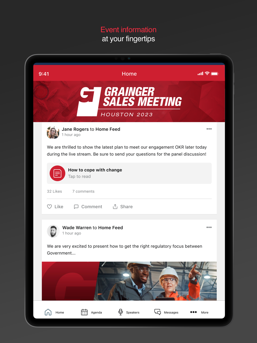 Mobile App for Grainger Events. Grainger believes in the power of connection, and this app allows us to bring our attendees together to share ideas, product innovations, and celebrate relationships.