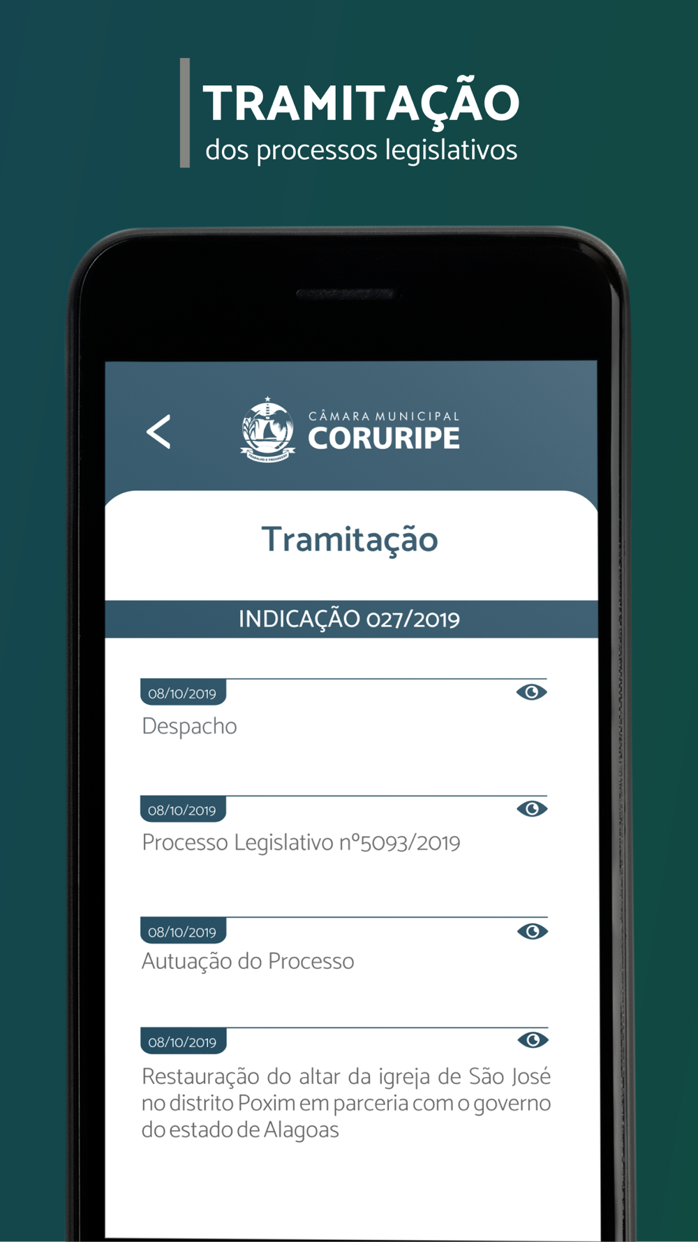 O aplicativo da Câmara Municipal de Coruripe apresenta todas as atividades dos vereadores e da Casa Legislativa, proporcionando uma experiência de maior aproximação com usuário, que passa a fazer o acompanhamento direto de todas as ações e trabalhos em tramitação da Câmara.