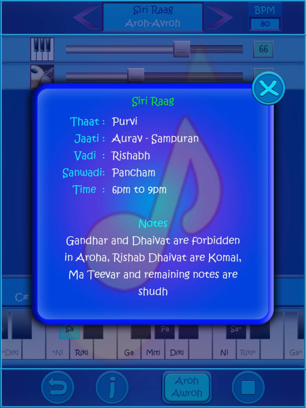 This is a music practice app. You can practice and improve your voice quality specially singing. There different patterns of music notes to sing with. these patterns are known as 'ALNKARS' in Indian classical music.There is a section called EAR TRAINING where you can train your listening to the music notes and patterns.You can practice with different Taalas (Rhythms) Like: Kehrwa ( 8 Beat ), Dadra (6 Beats), Roopak ( 7 Beats ), Deepchandi (14 Beats), Jhapp (10 Beats ) and Teentaal (16 Beats ) etc. At present we have 4 Alankaars and One Taal (Kewra ) to practice, But Soon we will add More ALANKAARS, More Taals and Raaga based patterns.