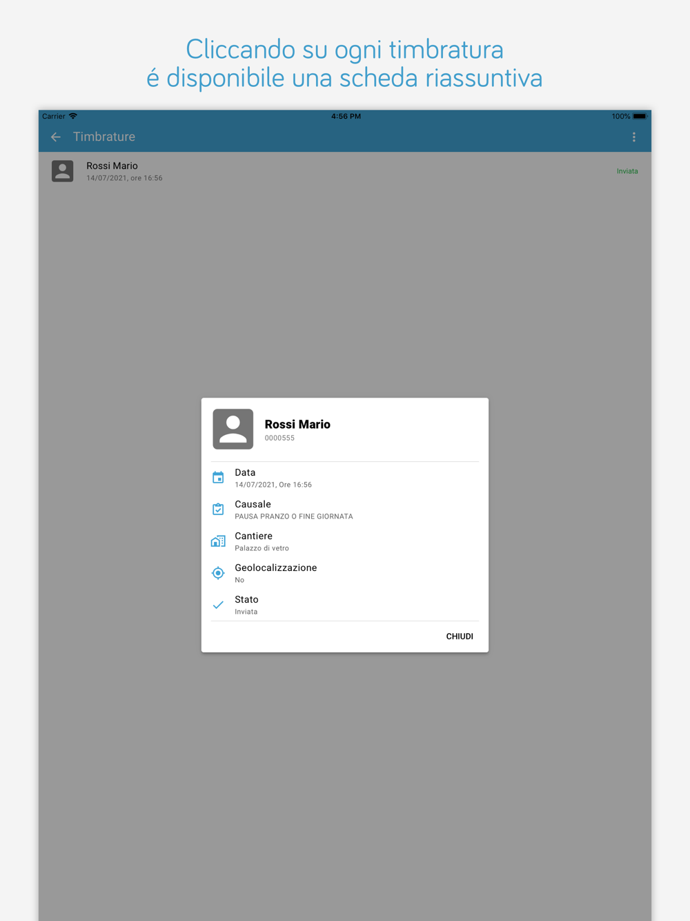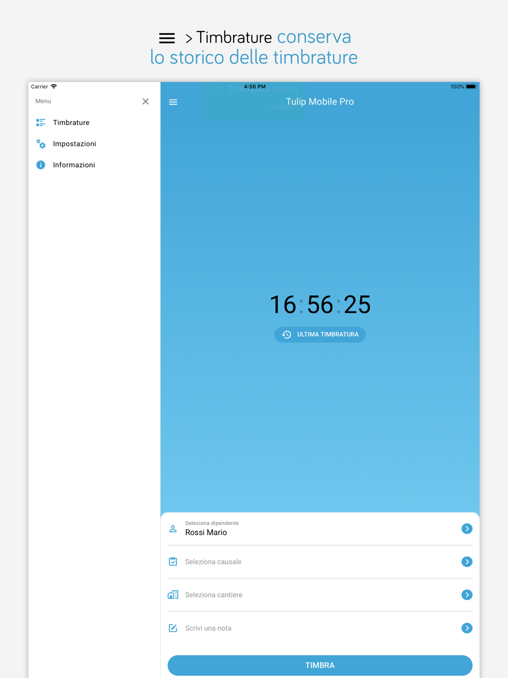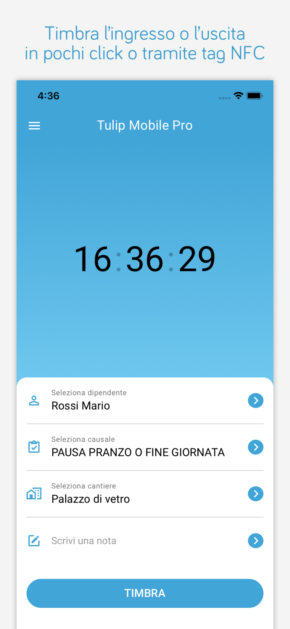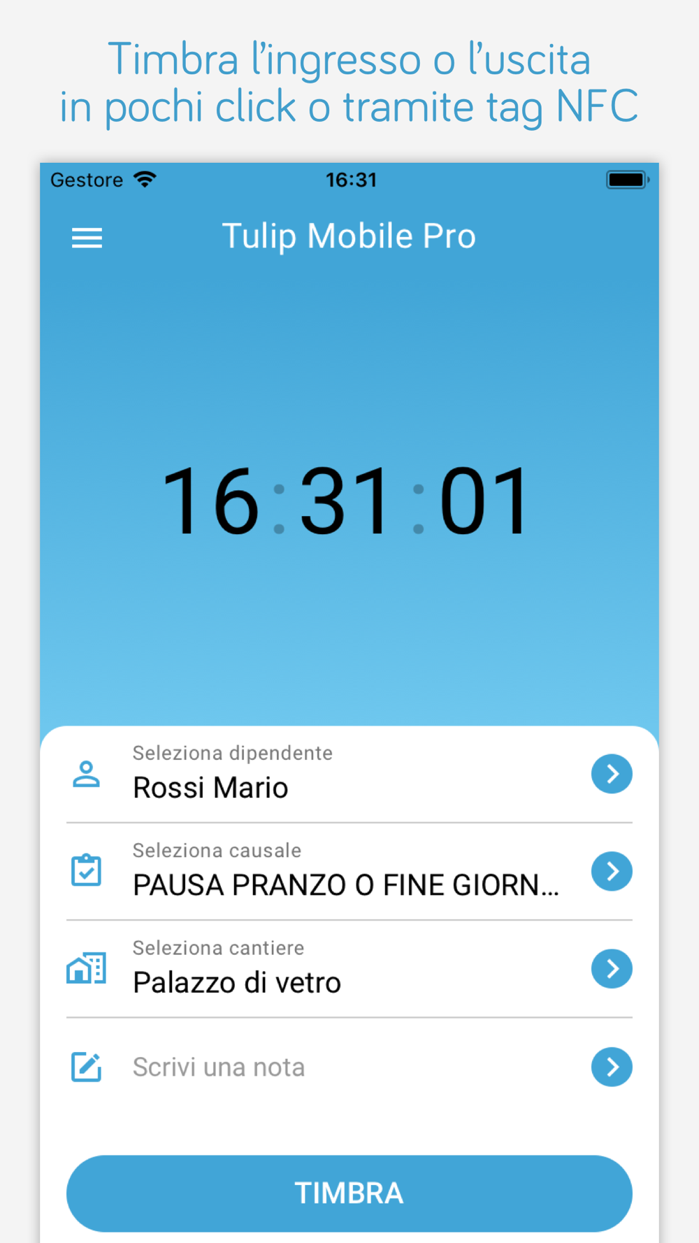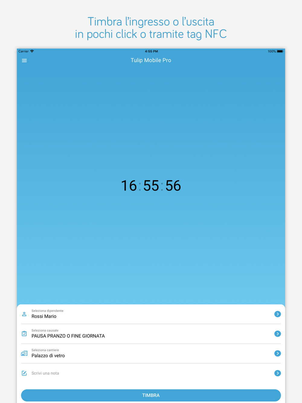 Tulip Mobile permette ai vostri dipendenti e collaboratori di timbrare da un qualsiasi smartphone iOS dotato di GPS integrato, ovunque si trovino, e di rilevare la loro esatta posizione geografica al momento della timbratura.