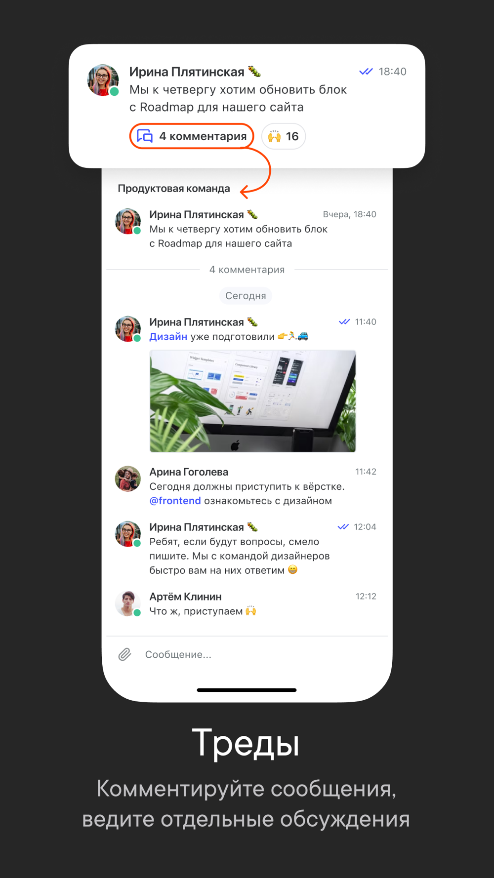 Используйте все возможности Пачки для рабочего общения: сквозные треды, новостные каналы, открытые и закрытые чаты.